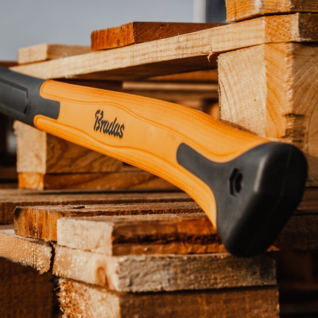 Der orangefarbene Teil des Stiels hat eine spezielle Struktur, die verhindert, dass sich das Werkzeug während der Arbeit in der Hand bewegt, das hakenförmige Ende des Stiels garantiert einen festen Griff und verhindert das Abrutschen der Axt.