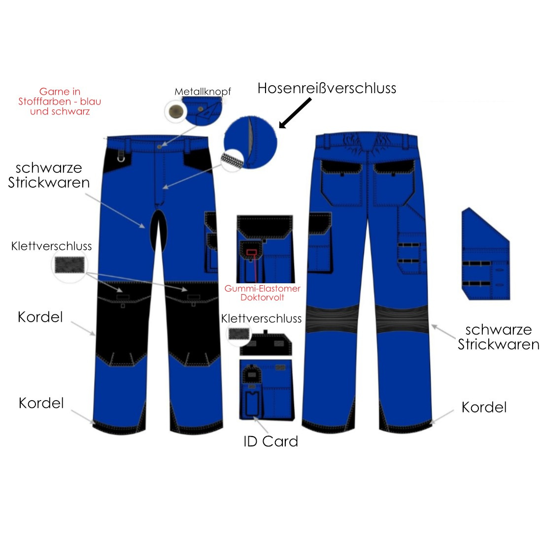 2 x Hintertaschen, Gesäßtaschen 1 x Zollstocktasche 1 x Hammertasche 1 x Handytasche |