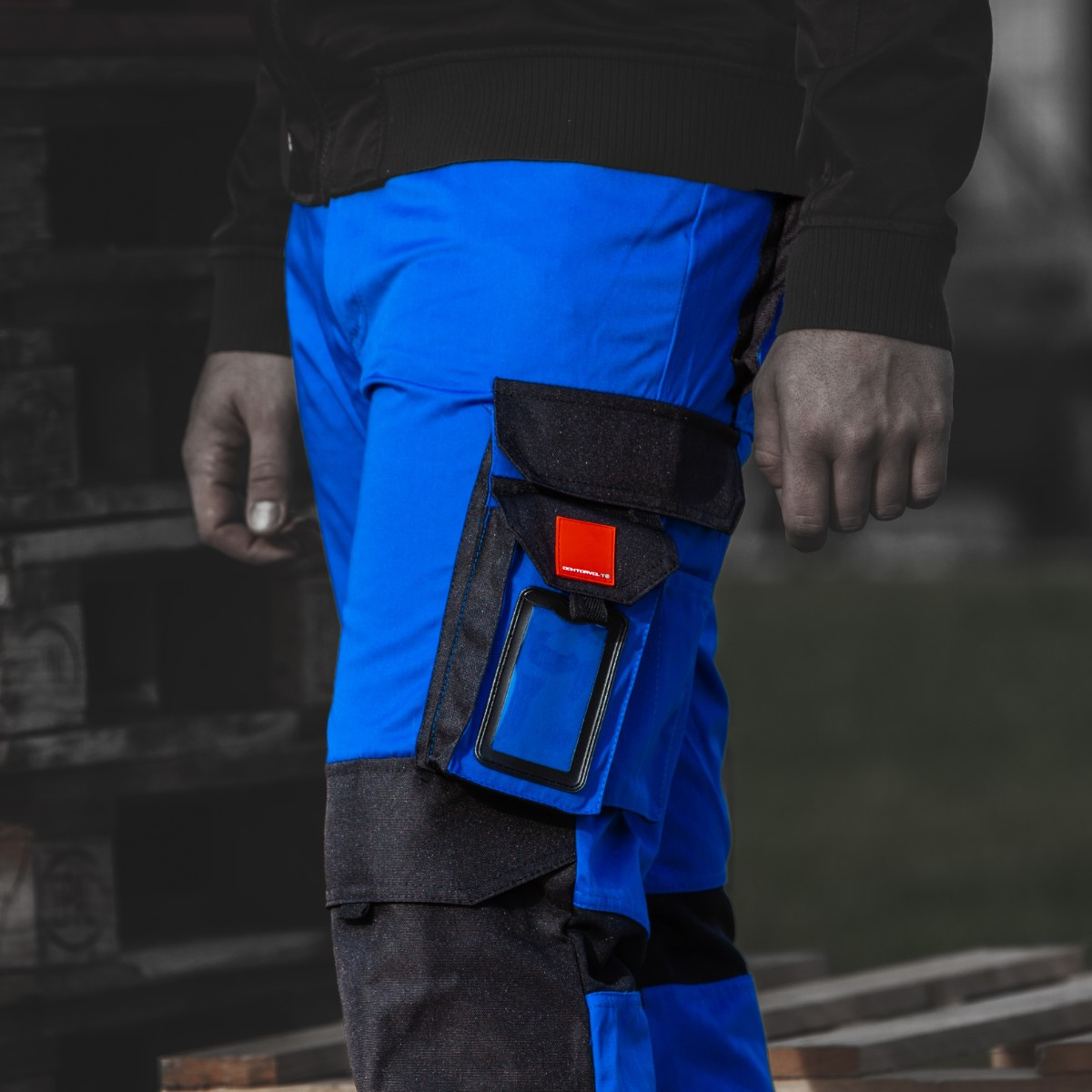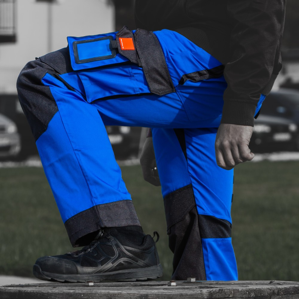 Die erste Option ist eine kurze Taillenhose. Sie zeichnen sich durch ein angenehmes Tragegefühl bei der Arbeit aus. Oben sind sie hinten in der Mitte mit einem Gummistreifen versehen (neue Bandmaschine). Zusätzlich wird es mit einem Metallknopf befestigt und hat 6 breite Schlaufen (1,8 cm) und eine große auf der Rückseite. Auf dem rechten Sack der versenkten Tasche (unter dem Gürtel) ein Gürtel mit einem eingenähten Klebeband (3 cm) und einem Metallhalbkreis (in der Tasche eingenäht). An den Hinterbeinen sind Taschen mit einem Faltenbalg auf einer Seite (Cordura) angebracht, die mit Klappen mit 2 Klettverschlüssen 4x2 cm bedeckt sind. Das Kleidungsstück hat auch einen doppelten Meter (2 Nadeln) unter der rechten Gesäßtasche und eine Stifttasche (mit 2 Löchern) und 2 Tragegurte aus Klebeband (2 cm). Hosenbeine sind aufgerollt und gesteppt. Zusätzlich ist im Schritt der Hose ein Keder eingenäht.