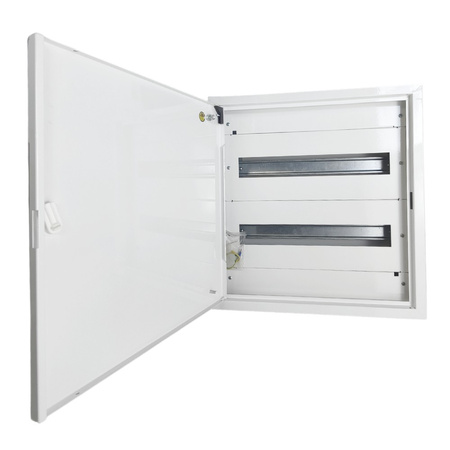 Der Verteilerkasten besteht aus 2 Reihen DIN-Schienen, auf denen 36 Module montiert werden können. Es besteht die Möglichkeit, 18 Module auf einer Schiene zu montieren. Der Verteilerschrank verfügt außerdem über eine Tür mit Drehschloss, die einen geschützten Zugang zum Inneren des Sicherungskasten ermöglicht. Die Türen sind so konzipiert, dass sie je nach Bedarf nach links oder rechts geöffnet werden können. Die Kabeleinführung ist sowohl von oben als auch von unten möglich, je nach Bedarf. Die durchdachte Konstruktion des Kastens erlaubt es, Kabel sowohl von unten als auch von oben zu verlegen. Ein weiterer Vorteil ist die Möglichkeit, jedes Element des Verteilerkasten abzuschrauben. Um das Innere des Kastens noch sicherer zu machen, kann das Türschloss durch ein Schlüsselschloss ersetzt werden. Die Elemente des Sicherungskastens sind pulverbeschichtet. Dadurch sind sie besser vor Korrosion geschützt.