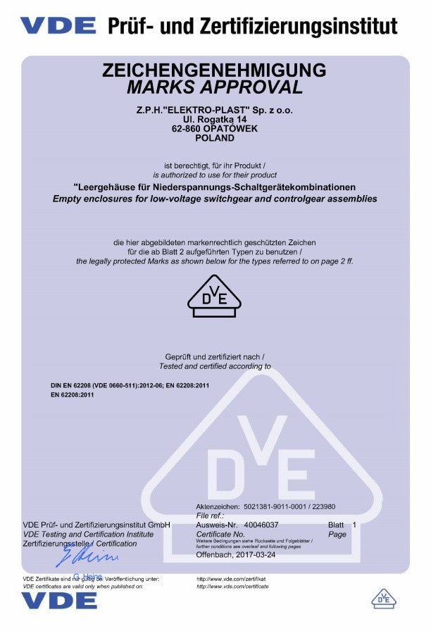 Ein qualitativ hochwertiges Produkt aus Materialien höchster Qualität. Produkte von Elektro-Plast haben das TÜV Rheinland Zertifikat erhalten. Die 24-Module Verteilerkasten RH-24 verfügt über die Schutzart IP65 (hermetisch) und ist daher für den Innen- und Außenbereich sowie in feuchten Bereichen geeignet. Die ideale Anwendung des Feuchtraumverteiler ist der Stromverteilerbau durch die Montage von modularen Geräten wie Leitungsschuzschaltern, Fehlerstromschutzschaltern, Phasenkontrollampen, Überspannungsableitern, Lasttrennschaltern usw. Das hermetische Gehäuse wird auf der Oberfläche installiert (Aufputz). Ein weiterer Vorteil der Sicherungskasten ist die Nennspannung bis 1000V, so dass sie für Solaranlagen PV eingesetzt werden kann.