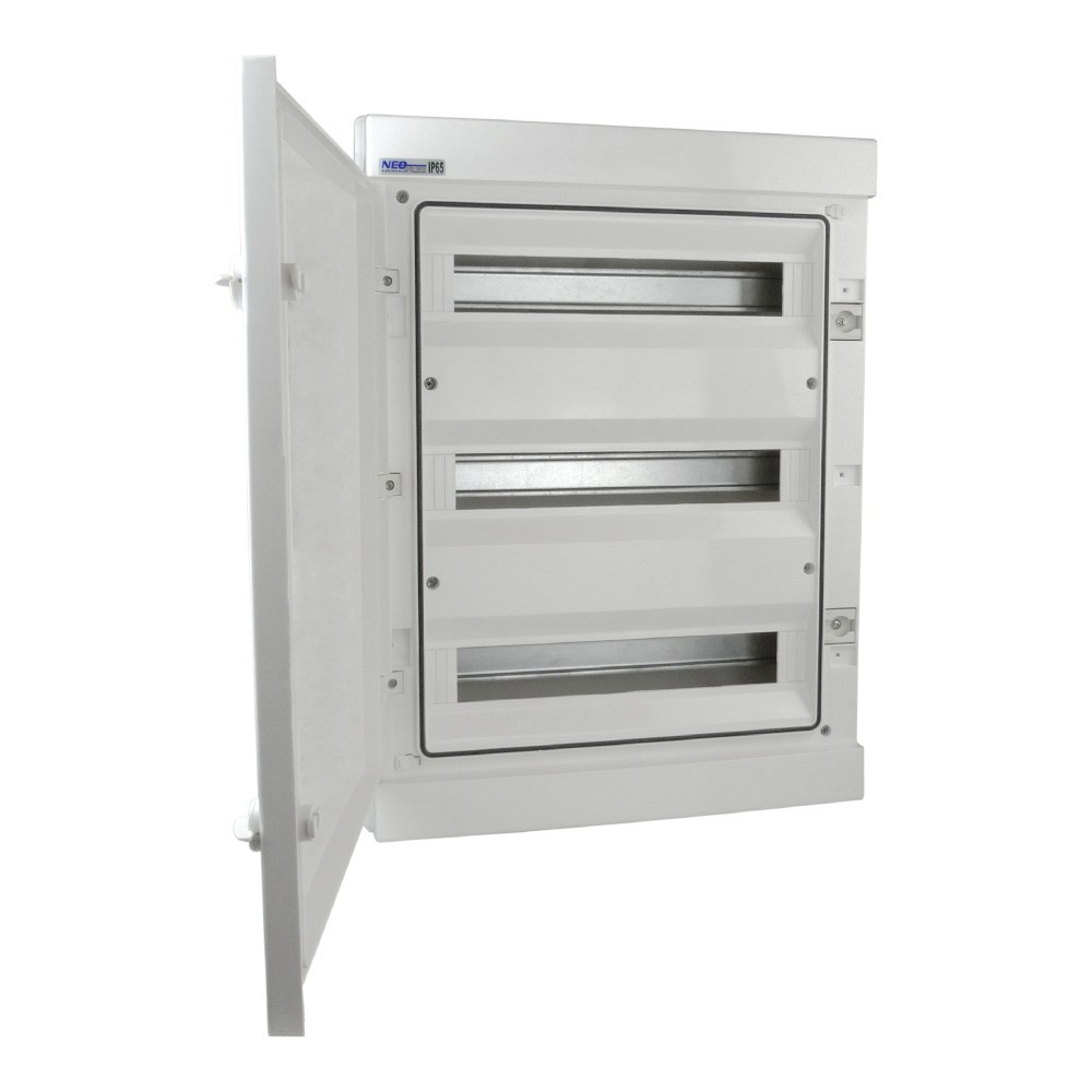 Ein qualitativ hochwertiges Produkt aus Materialien höchster Qualität. Produkte von Elektro-Plast haben das TÜV Rheinland Zertifikat erhalten. Die 54-Module Verteilerkasten RH-54/4B verfügt über die Schutzart IP65 (hermetisch) und ist daher für den Innen- und Außenbereich sowie in feuchten Bereichen geeignet. Die ideale Anwendung des Feuchtraumverteiler ist der Stromverteilerbau durch die Montage von modularen Geräten wie Leitungsschuzschaltern, Fehlerstromschutzschaltern, Phasenkontrollampen, Überspannungsableitern, Lasttrennschaltern usw. Das hermetische Gehäuse wird auf der Oberfläche installiert (Aufputz). Ein weiterer Vorteil der Sicherungskasten ist die Nennspannung bis 1000V, so dass sie für Solaranlagen PV eingesetzt werden kann. Verteilerkasten mit weiße Gehäuse und Tür.