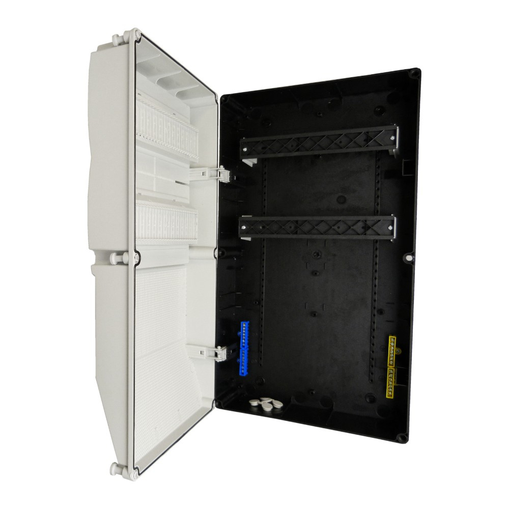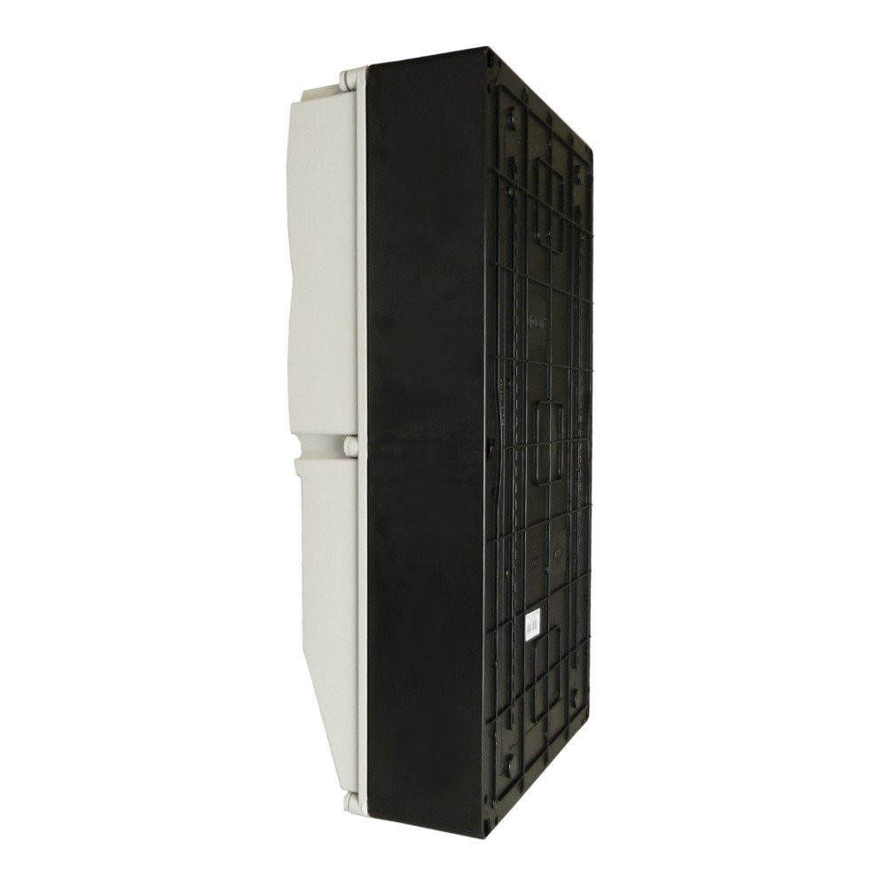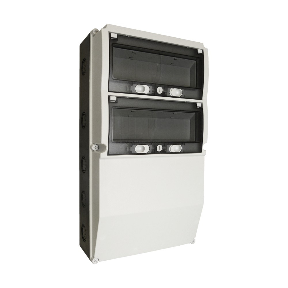 Der Aufputz-Verteilerkasten ist für die Montage von Schutzschaltern, FI-Schaltern und Steckdosen geeignet. Das Gehäuse IP66 aus Kunststoff mit getönten Polycarbonat-Türen und Membranen M40–M50 bietet Schutz und Benutzerfreundlichkeit.