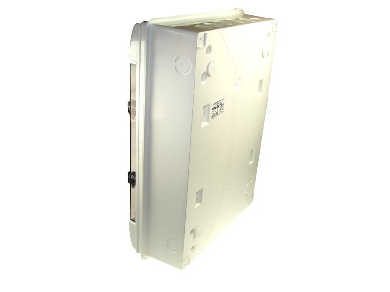 Ein qualitativ hochwertiges Produkt aus Materialien höchster Qualität. Produkte von Elektro-Plast haben das TÜV Rheinland Zertifikat erhalten. Die 24-Module Verteilerkasten RH-24/B verfügt über die Schutzart IP65 (hermetisch) und ist daher für den Innen- und Außenbereich sowie in feuchten Bereichen geeignet. Die ideale Anwendung des Feuchtraumverteiler ist der Stromverteilerbau durch die Montage von modularen Geräten wie Leitungsschuzschaltern, Fehlerstromschutzschaltern, Phasenkontrollampen, Überspannungsableitern, Lasttrennschaltern usw. Das hermetische Gehäuse wird auf der Oberfläche installiert (Aufputz). Ein weiterer Vorteil der Sicherungskasten ist die Nennspannung bis 1000V, so dass sie für Solaranlagen PV eingesetzt werden kann. Verteilerkasten mit weißem Gehäuse und Tür.