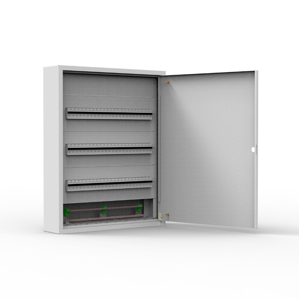 Der Verteilerkasten besteht aus 3 Reihen DIN-Schienen, auf denen 72 Module montiert werden können. Es besteht die Möglichkeit, 24 Module auf einer Schiene zu montieren. Der Verteilerschrank verfügt außerdem über eine Tür mit Drehschloss, die einen geschützten Zugang zum Inneren des Sicherungskasten ermöglicht. Die Türen sind so konzipiert, dass sie je nach Bedarf nach links oder rechts geöffnet werden können. Die Kabeleinführung ist sowohl von oben als auch von unten möglich, je nach Bedarf. Die durchdachte Konstruktion des Kastens erlaubt es, Kabel sowohl von unten als auch von oben zu verlegen. Ein weiterer Vorteil ist die Möglichkeit, jedes Element des Verteilerkasten abzuschrauben. Um das Innere des Kastens noch sicherer zu machen, kann das Türschloss durch ein Schlüsselschloss ersetzt werden. Die Elemente des Sicherungskastens sind pulverbeschichtet. Dadurch sind sie besser vor Korrosion geschützt.