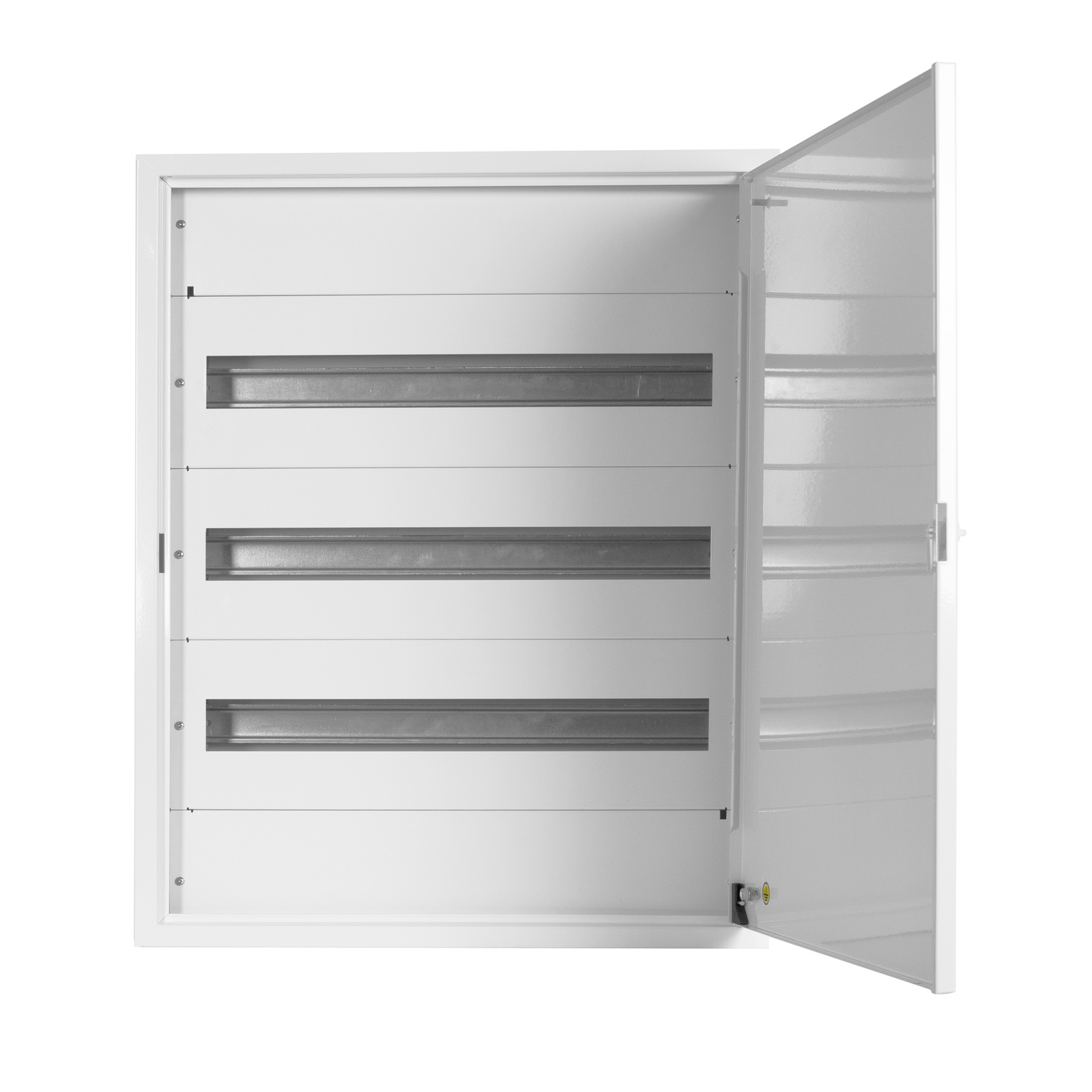 Der Verteilerkasten besteht aus 3 Reihen DIN-Schienen, auf denen 72 Module montiert werden können. Es besteht die Möglichkeit, 24 Module auf einer Schiene zu montieren. Der Verteilerschrank verfügt außerdem über eine Tür mit Drehschloss, die einen geschützten Zugang zum Inneren des Sicherungskasten ermöglicht. Die Türen sind so konzipiert, dass sie je nach Bedarf nach links oder rechts geöffnet werden können. Die Kabeleinführung ist sowohl von oben als auch von unten möglich, je nach Bedarf. Die durchdachte Konstruktion des Kastens erlaubt es, Kabel sowohl von unten als auch von oben zu verlegen. Ein weiterer Vorteil ist die Möglichkeit, jedes Element des Verteilerkasten abzuschrauben. Um das Innere des Kastens noch sicherer zu machen, kann das Türschloss durch ein Schlüsselschloss ersetzt werden. Die Elemente des Sicherungskastens sind pulverbeschichtet. Dadurch sind sie besser vor Korrosion geschützt.