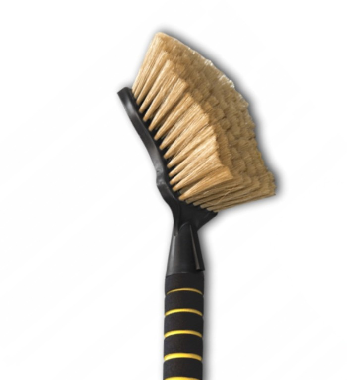 Der Griff hat Schaumstoff, durch den die Bürste beim Waschen nicht rutscht. Gleichzeitig erleichtert der ergonomische Griff die Verwendung der Bürste sowohl beim Anschluss an einen Wasserschlauch als auch ohne.