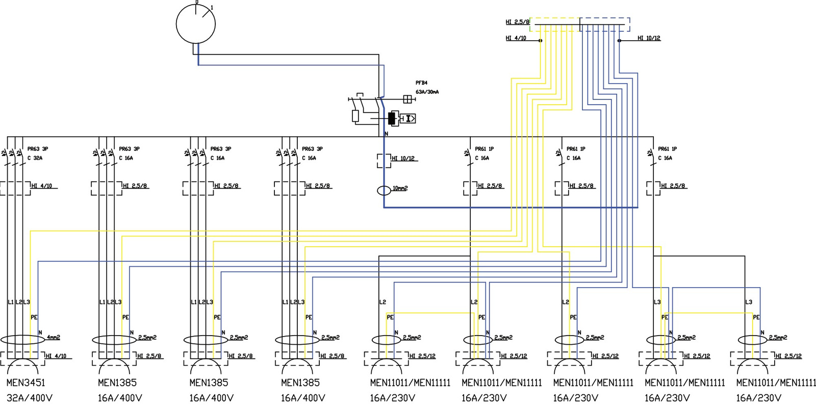- Überstromschutz der Stromsteckdosen: 3x C16 3P 10kA