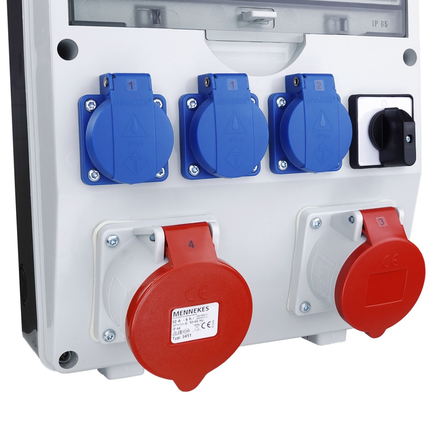 ✔️ ausgestattet mit drei 3x 230 V 16 A Steckdosen und 400 V 16 A und 400 V 32 A Mennekes-Steckdosen,