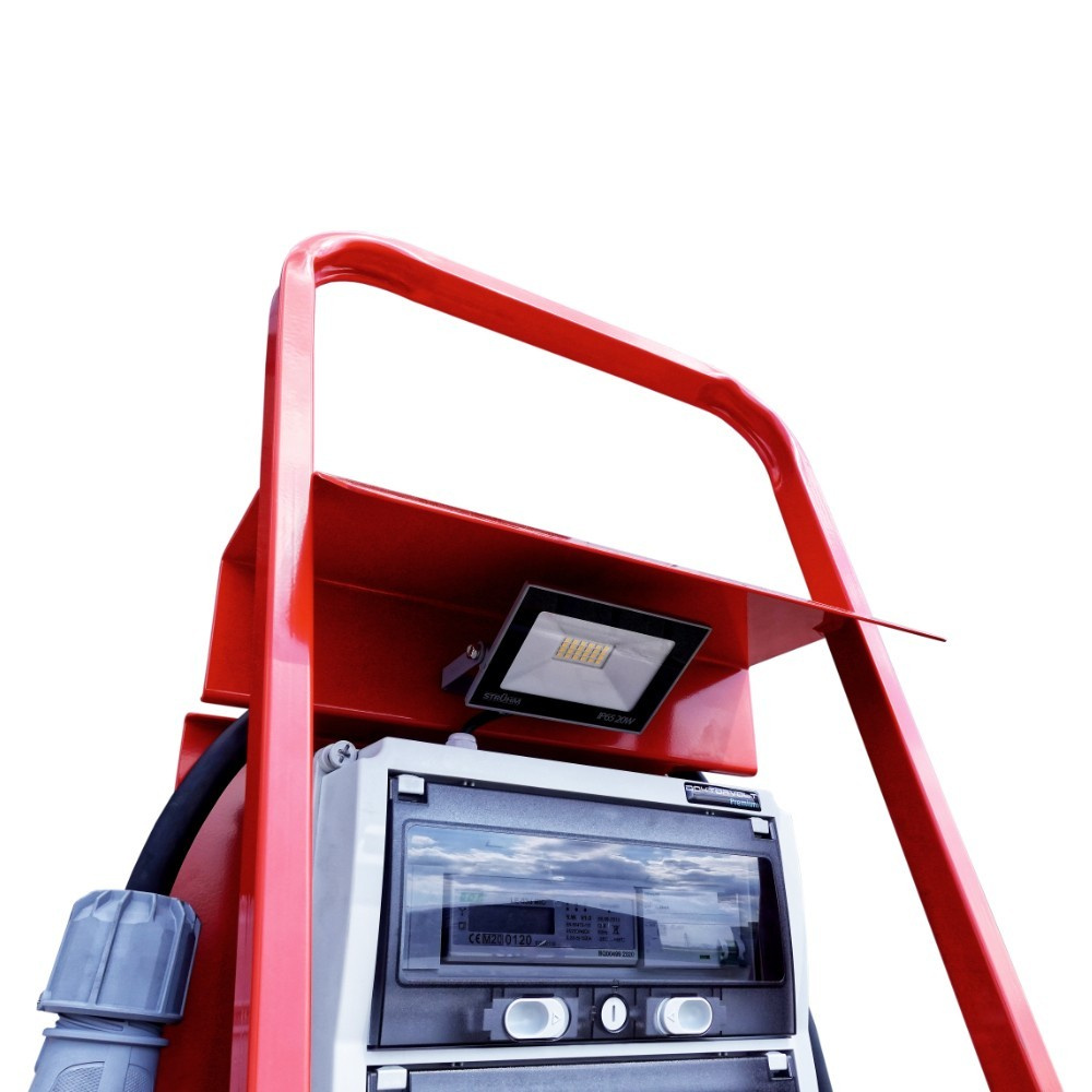 - Tragbarer Stromverteiler, stabilem Ständer und Energieverbrauchszähler. Wetterbeständig, ideal für Baustellen, Outdoor-Events und Industrieeinsätze.