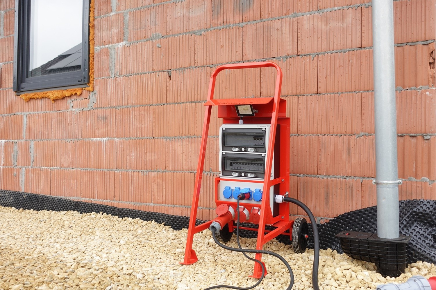 Der Baustromkasten verfügt über 230V- und 400V-CEE-Steckdosen, Leitungsschutzschalter, FI-Schutzschalter, Zuleitungskabel sowie ein stabiles Stativ mit Dach und LED-Arbeitsleuchte.