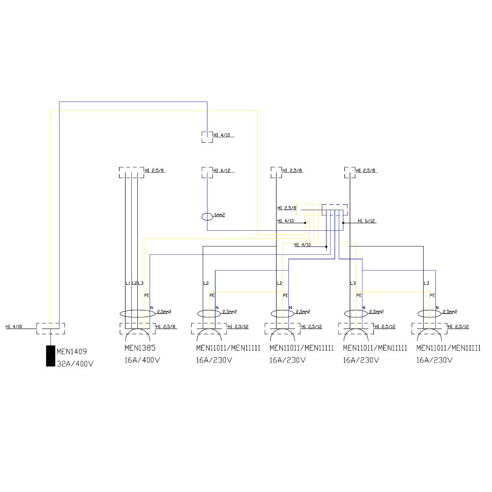 - Verkabelungtyp: H07V-K Leitung 2,5, 4 mm² gelb-grün, schwarz, und 2,5, 4, 6 mm² blau
