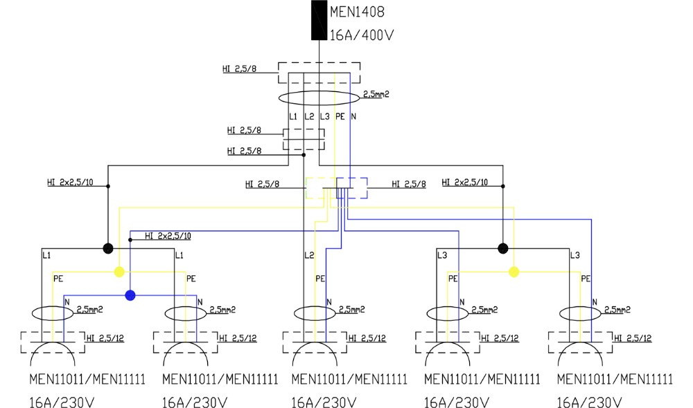 | Verkabelungtyp | H07V-K Leitung 2,5 mm2 gelb-grün H07V-K Leitung 2,5 mm2 Schwarz H07V-K Leitung 2,5 mm2 Blau |