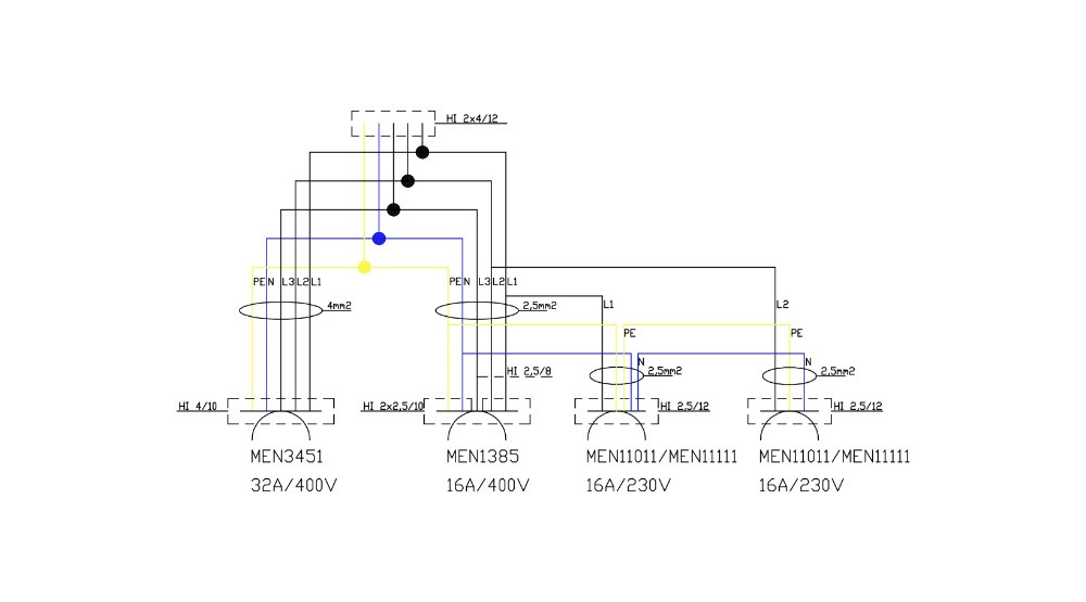✔️ ausgestattet mit zwei 2x 230 V 16 A Steckdosen und 1x 400 V 16 A, 1x 400V 32A Mennekes-Steckdosen,
