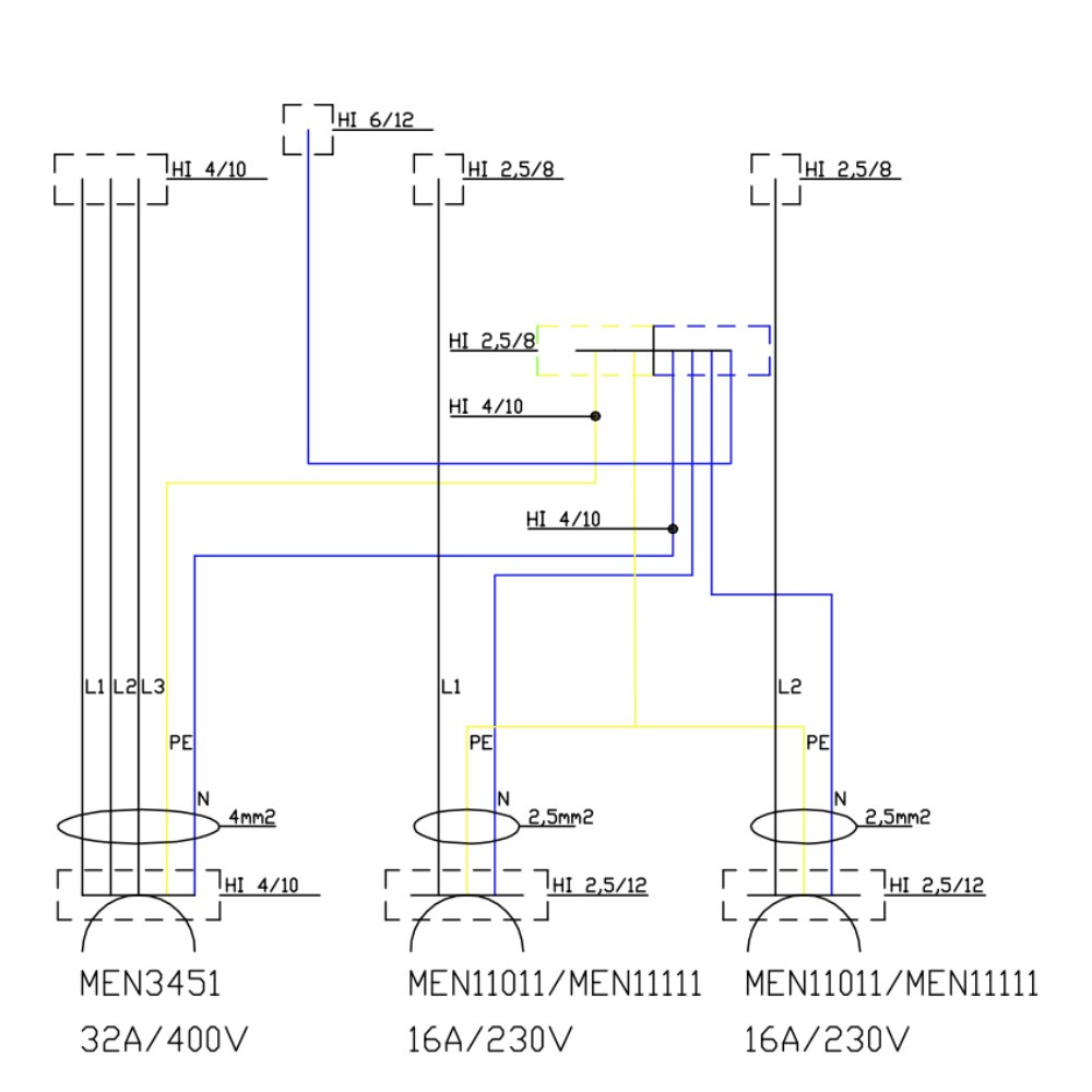 ✔️ ausgestattet mit zwei 2x 230 V 16 A Steckdosen und 1x 400 V 32 A Mennekes-Steckdosen,