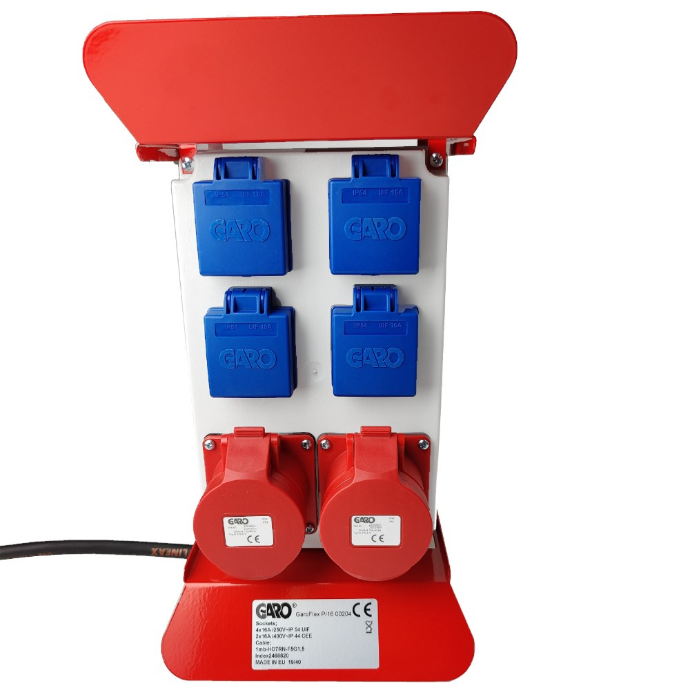 Der Stromverteiler verfügt über 4x 230V 16A Schuko-Steckdosen IP54 und 2x 16A 400V IP44 CEE-Steckdosen mit Sicherheitsklappdeckeln zum Schutz vor Staub und Wasser.