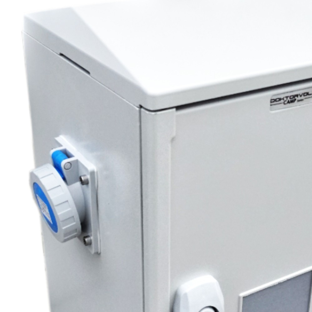 - mit zwei 230V 16A 3P CEE-Steckdosen und einem Lasttrennschalter RV63N 63A 230V 3+N 4P ausgestattet