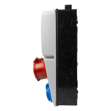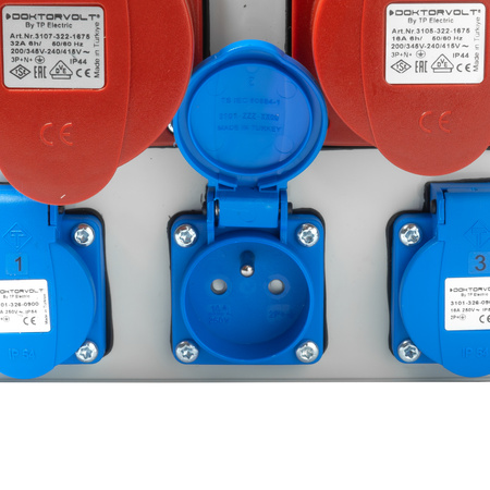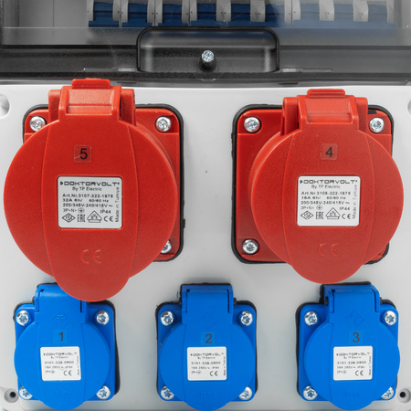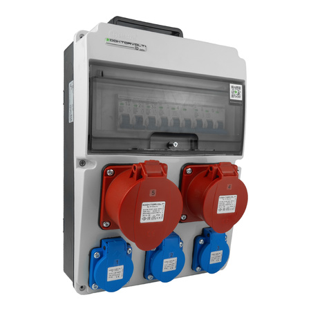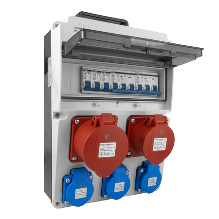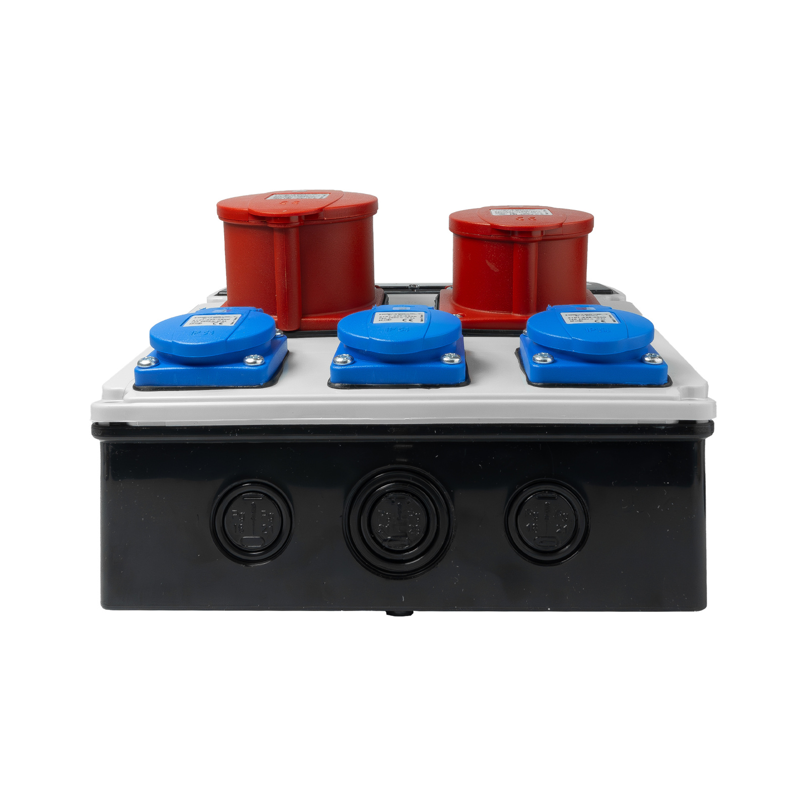 Der Baustromverteiler der CAS-Serie ist mit zwei CEE Steckdosen ausgestattet: einer 16A und einer 32A Steckdose. Der Stromverteier verfügt außerdem über drei 230V 16A Steckdosen Typ E. Jeder Stromverteiler ist in einem Gehäuse aus den besten Materialien mit Schutzart IP44 gefertigt.