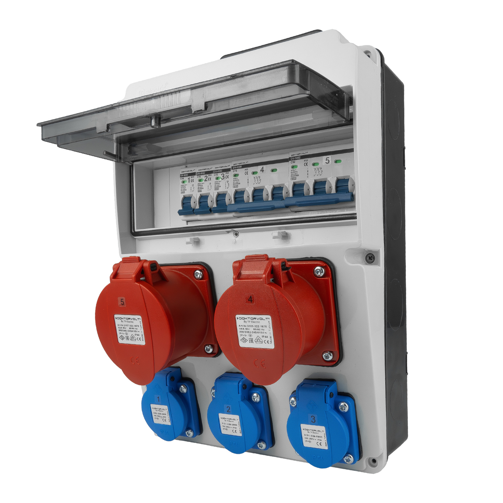 - Robuster Baustromverteiler mit Tragegriff, ausgestattet mit CEE-Steckdosen 16A & 32A, drei 230V Typ E Steckdosen sowie integrierten LS-Schaltern (Leitungsschutzschaltern) für jede Phase.