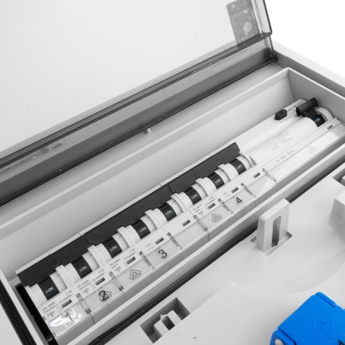 - Robuste IP44-Baustromverteiler mit 4 x 230 V und 2 CEE-Steckdosen (400 V). Sie sind aus hochwertigen Materialien hergestellt. Baustromverteiler wurde mit einem 12-moduligen Revisionsfenster und einem Griff ausgestattet, der die Arbeit mit der Stromverteil