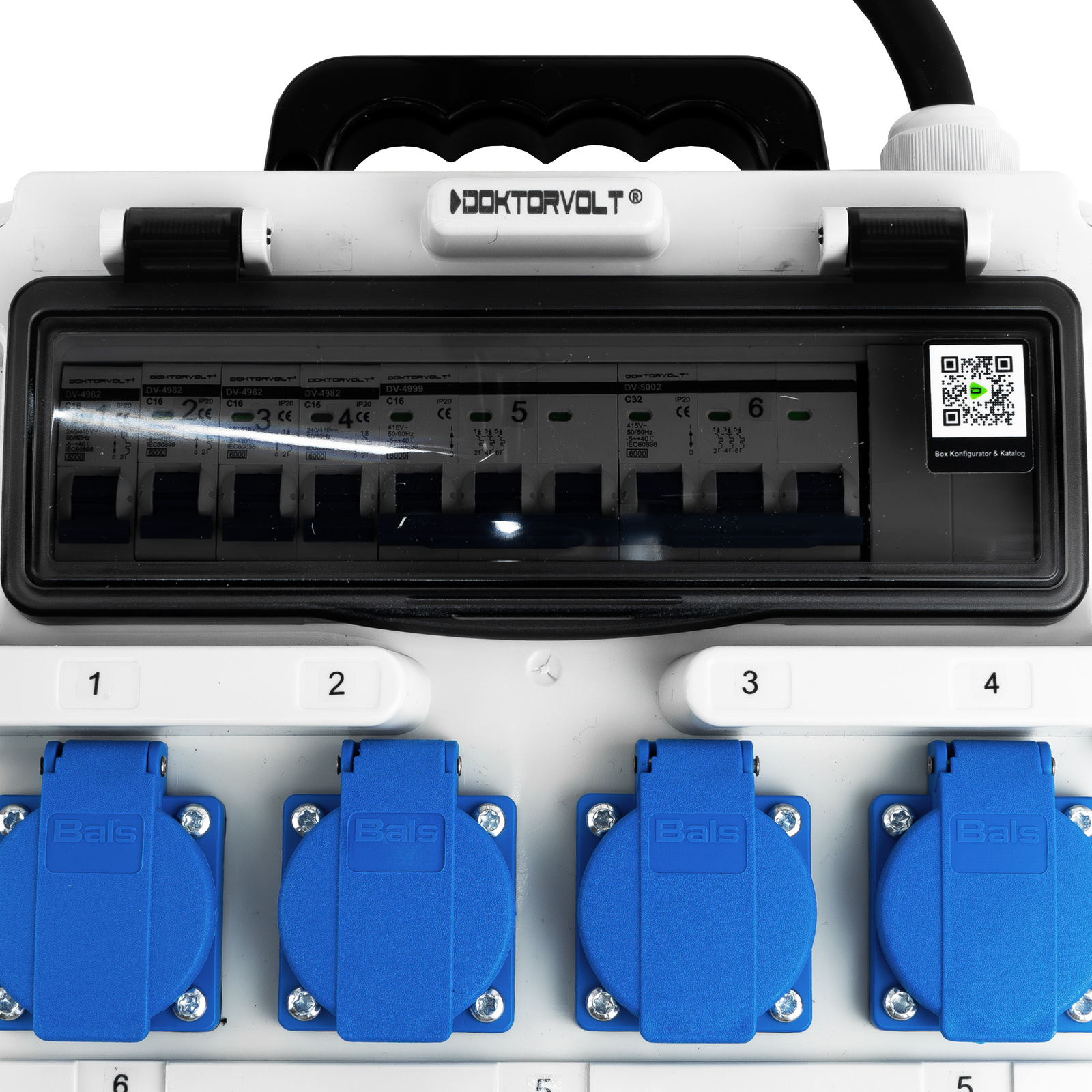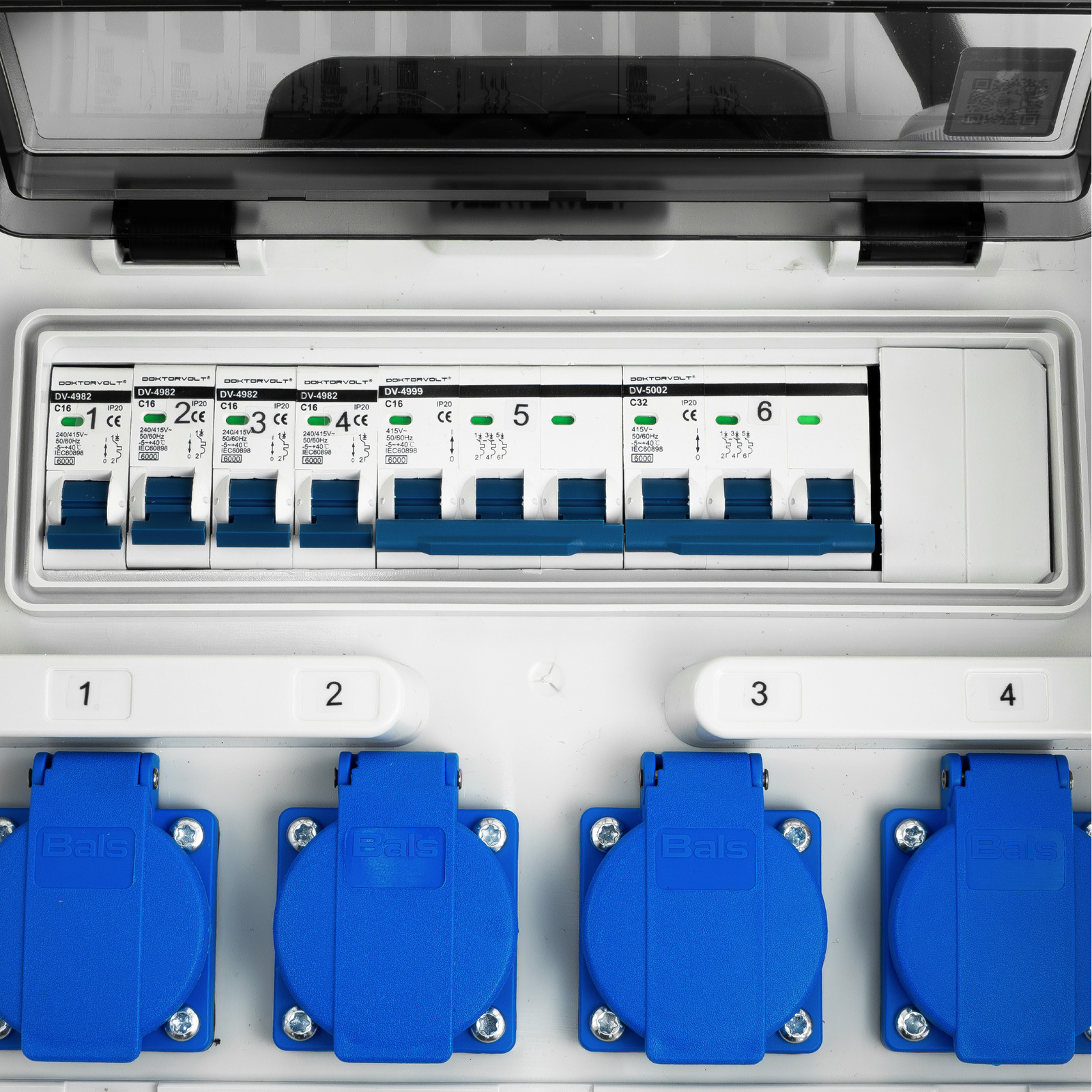 - Baustromverteiler mit LS-Schaltern und Sichtfenster zur Erleichterung der Bedienung. Ausgestattet mit drei CEE-Steckdosen und vier Schutzkontaktsteckdosen 230 V. Mobiler Verteiler mit vormontiertem 1-Meter-Anschlusskabel, CEE-Stecker und Tragegriff.