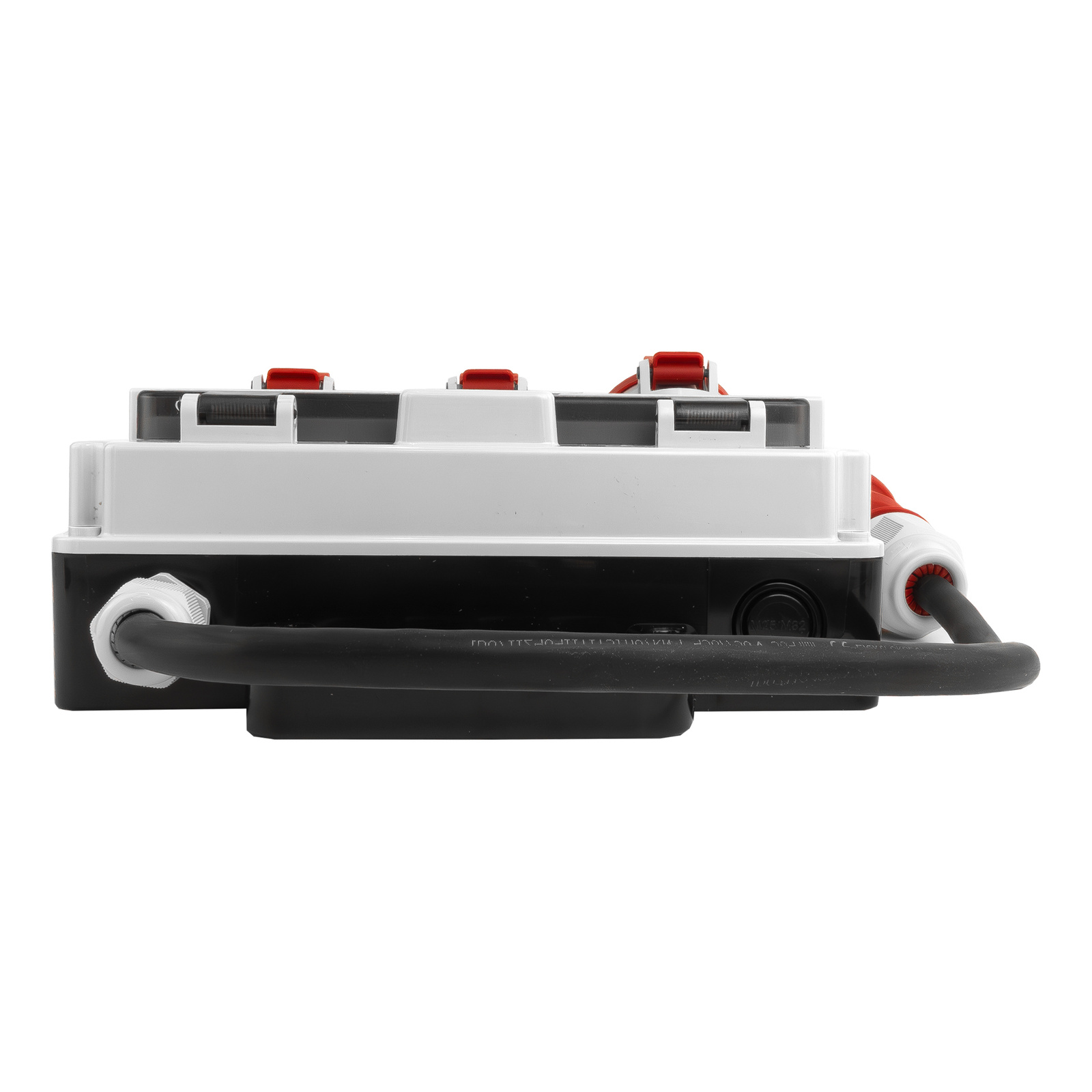 Stromverteiler aus der TR-Serie. Ausgestattet mit CEE-Steckdosen und 230V TYP E Steckdosen. Zur Zusatzausstattung gehören ein Sichtfenster und ein 1 m langes Kabel mit CEE-Stecker.