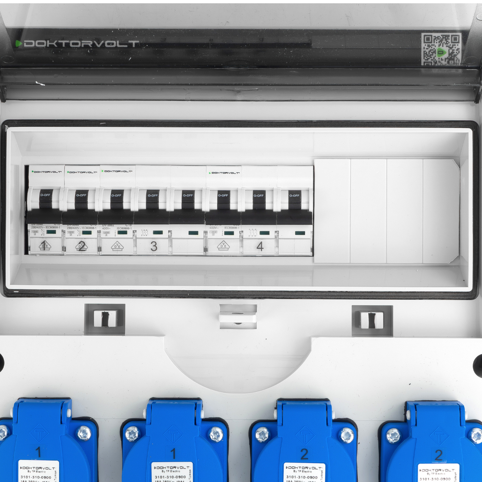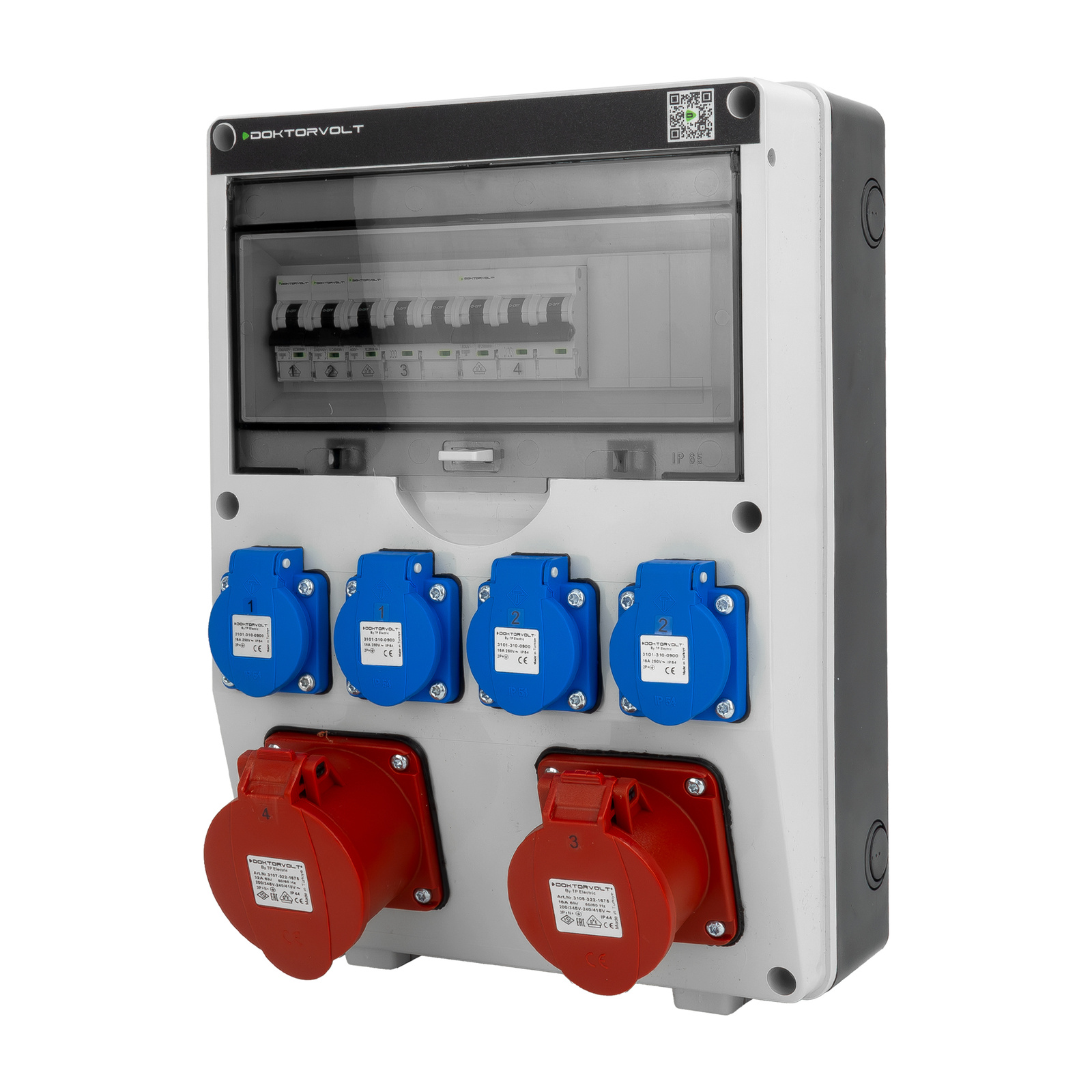 Dieser robuste IP44-Stromverteiler verfügt über vier 230V und zwei CEE-Steckdosen 400V. Er ist aus hochwertigen Materialien gefertigt. Der Baustromverteiler ist mit einem 12-moduligen Revisionsfenster und Leitungsschutzschalter der Marke Doktorvolt ausgestattet.