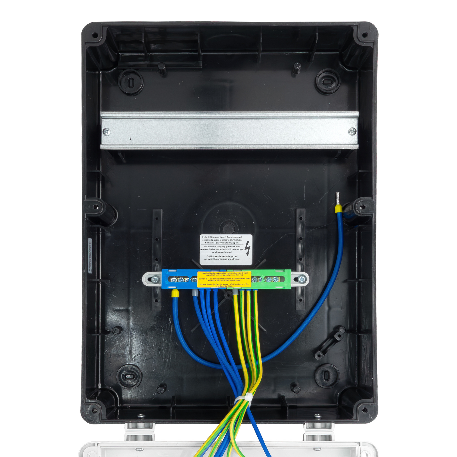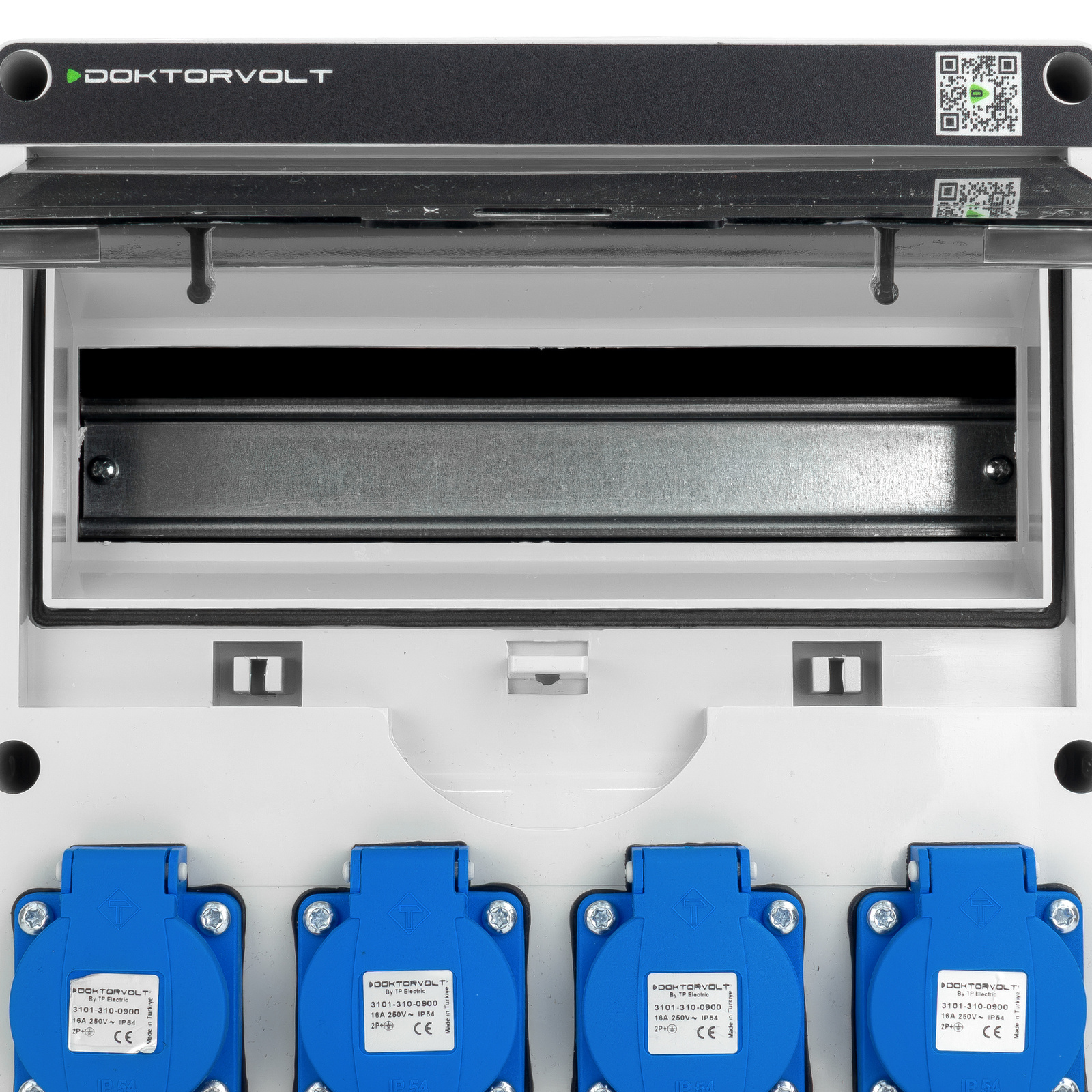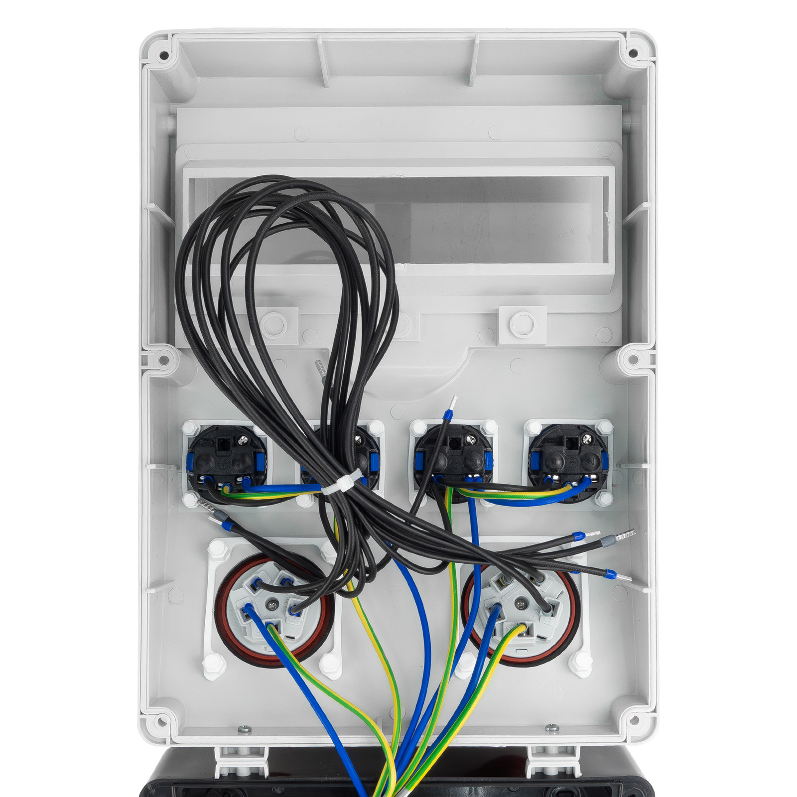 - Robuste IP44-Baustromverteiler mit 4 x 230 V und 2 CEE-Steckdosen (400 V). Sie sind aus hochwertigen Materialien hergestellt. Der Stromverteiler ist mit einem 12-moduligen Revisionsfenster ausgestattet.