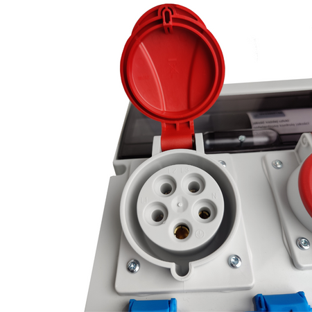 Der Stromverteiler ist mit drei Steckdosen 230V 16A 1P+N+PE mit Schutzart IP54 ausgestattet, die zusätzlich durch einen Fehlerstromschutzschalter 40A 4P 30mA AC geschützt sind, um das Risiko eines Stromschlags zu minimieren. Der Baustromverteiler enthält zwei CEE Steckdosen 16A und 32A.