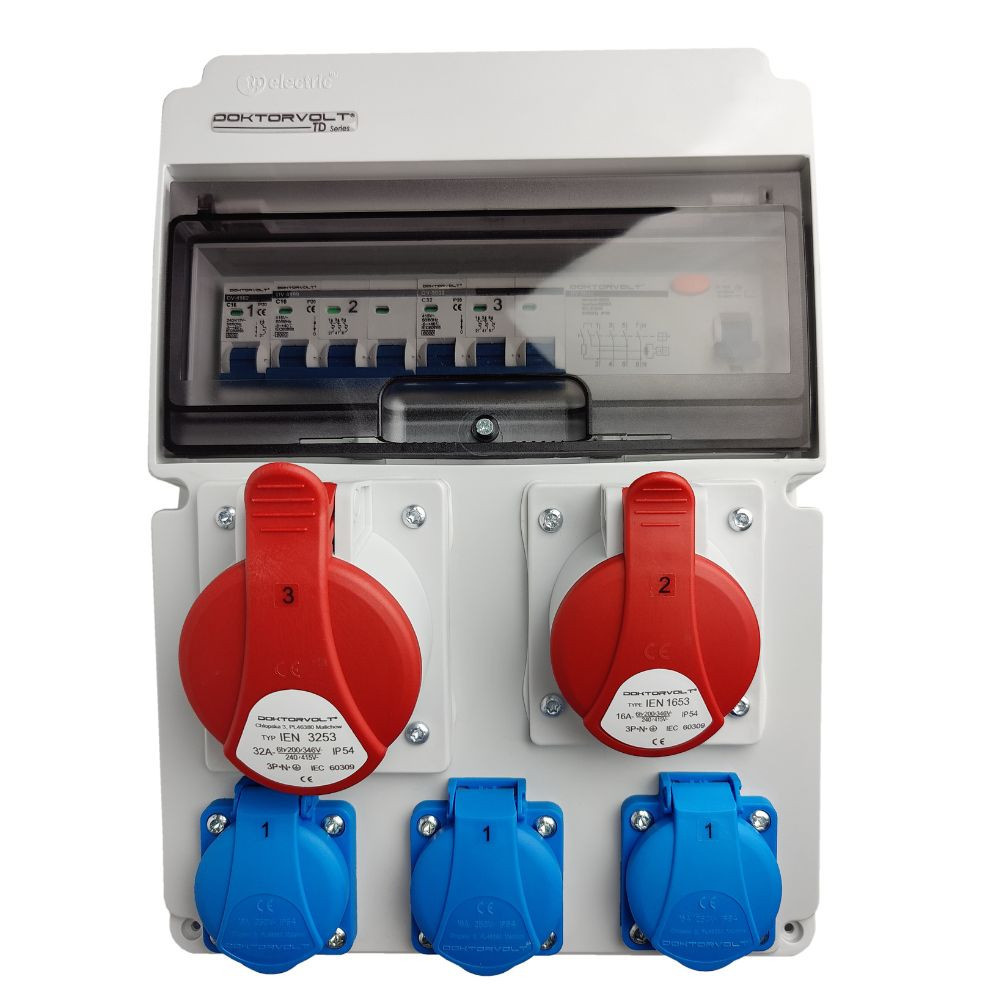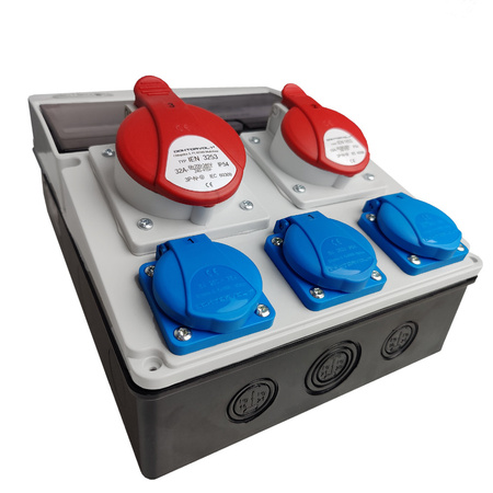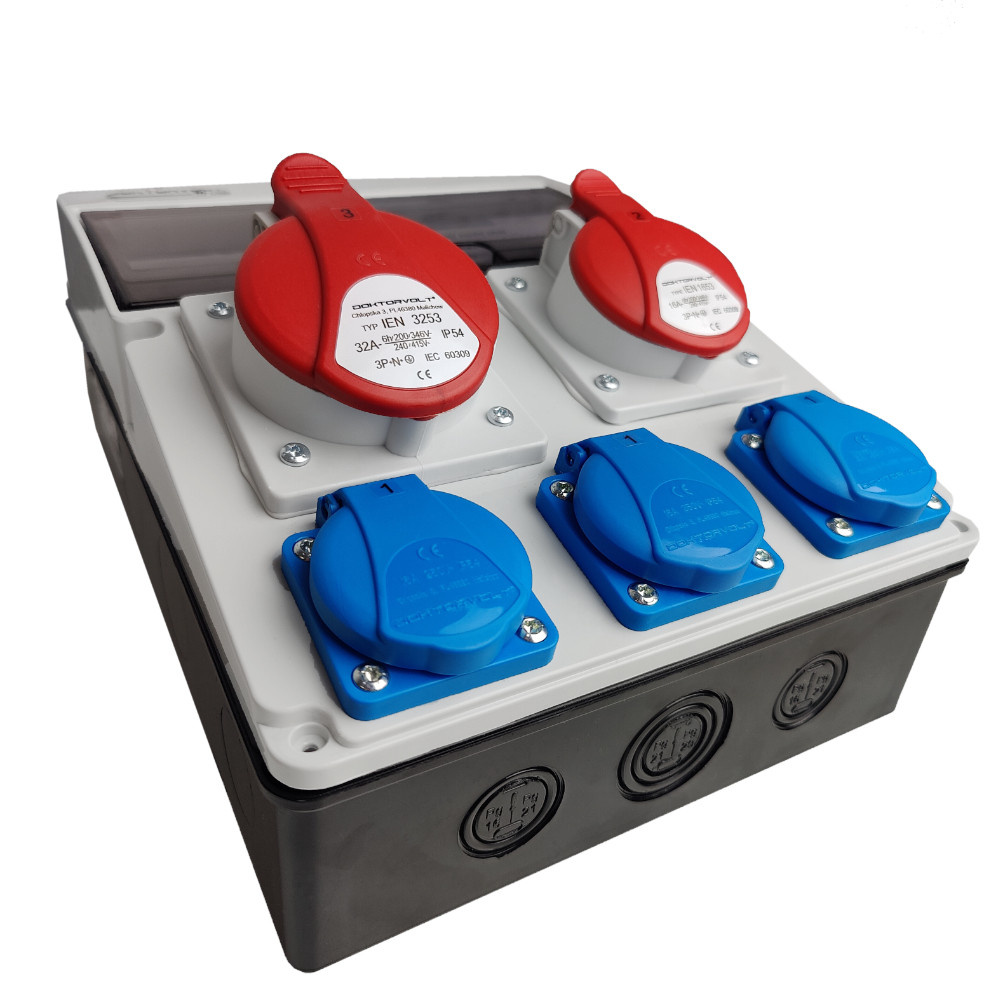 - Robuster baustromverteiler mit 1x 32A, 1x 16A CEE und 3x 230V SCHUKO Steckdsoen. Schutzart IP54 – staub- und spritzwassergeschützt. Ideal für Baustellen, Werkstätten und Industrieeinsätze.