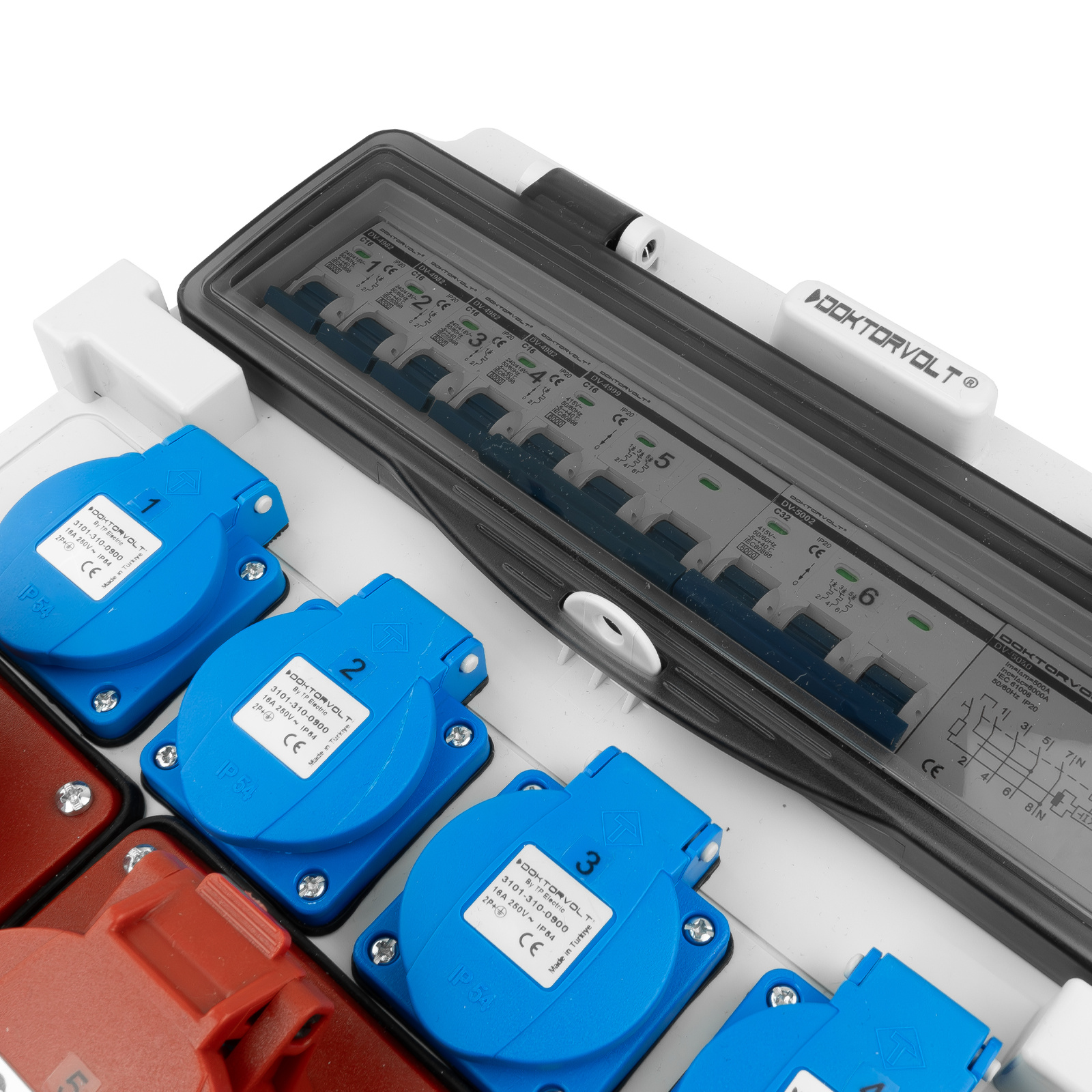 - Der Stromverteiler DV-5053-D der Marke DOKTORVOLT ist eine zuverlässige Lösung für anspruchsvolle Installationen, ausgestattet mit 4x robusten Schuko- und 3x32A / 3x16A CEE-Steckdosen, die Flexibilität beim Anschluss von Geräten bieten.