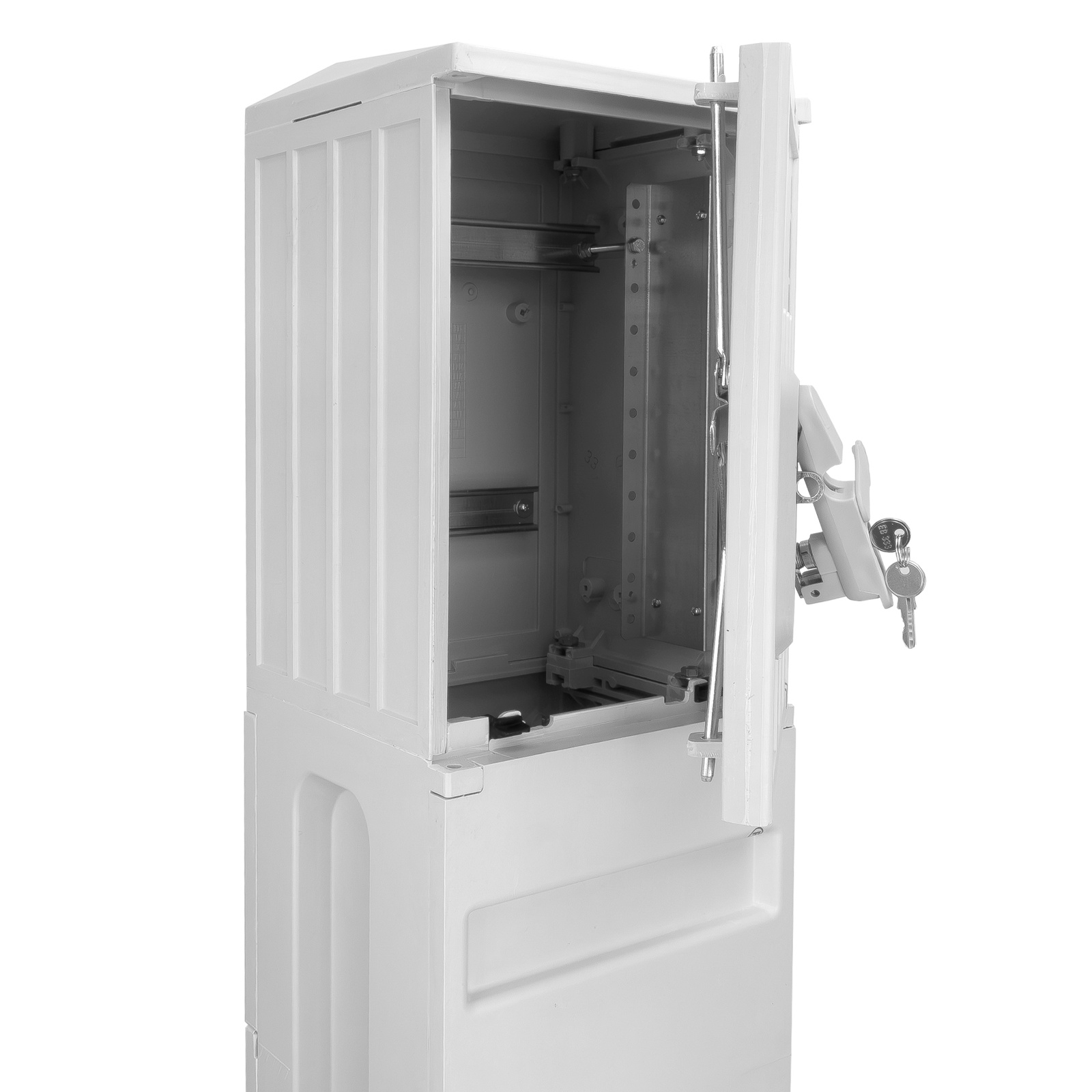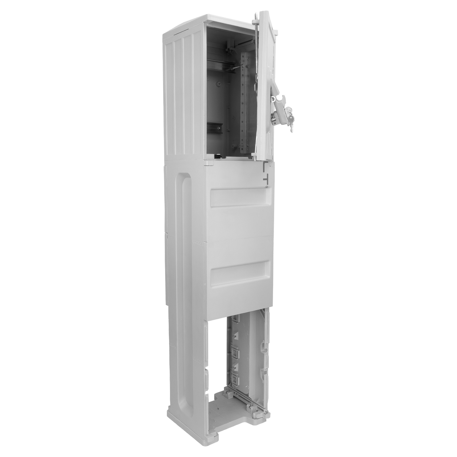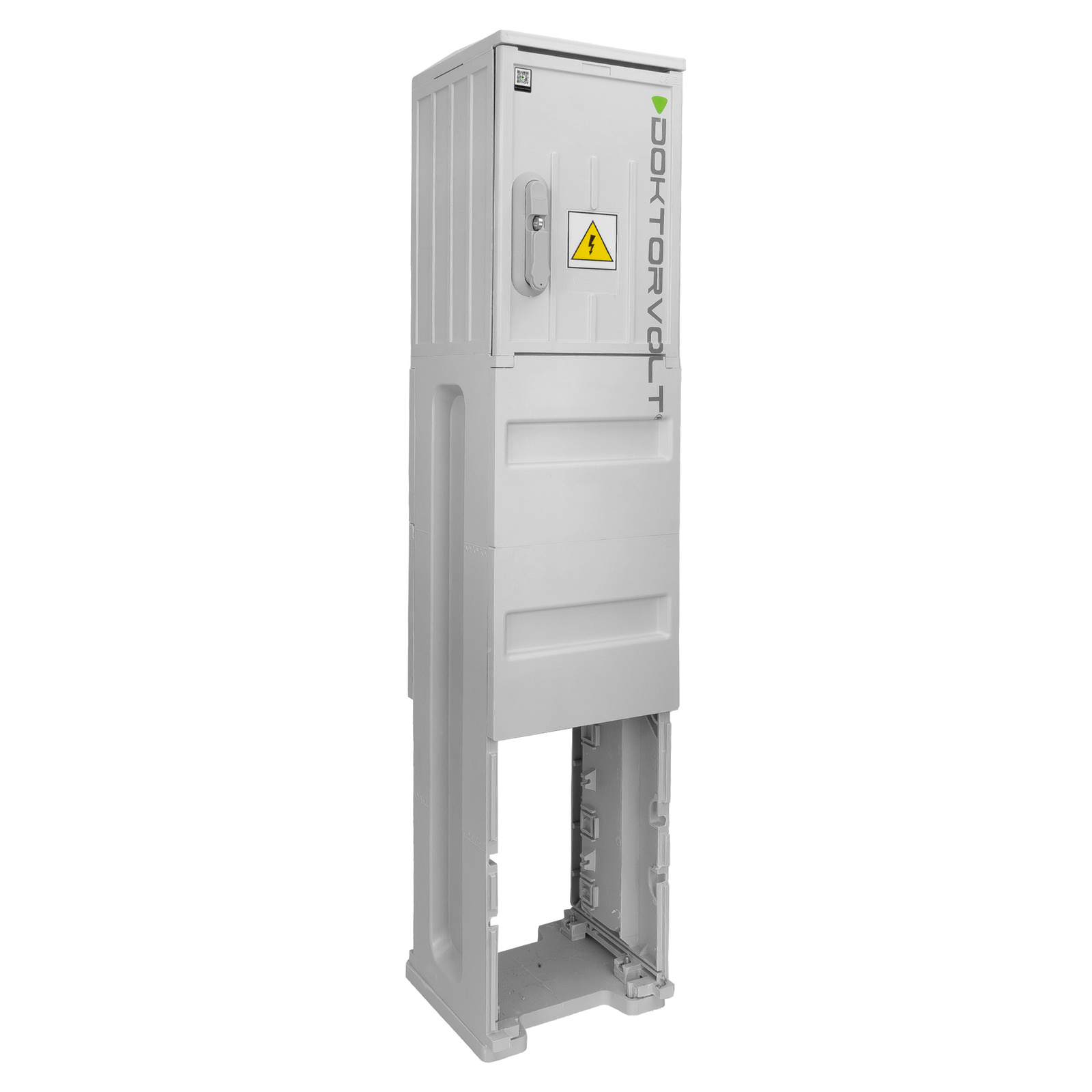 Das Fundamentgehäuse besteht aus duroplastischem, glasfaserverstärktem SMC-Polyester. Robuste, stationäre Konstruktion, UV-beständig und für den Erdeinbau geeignet. Sorgt für eine sichere und stabile Montage des Verteilers.