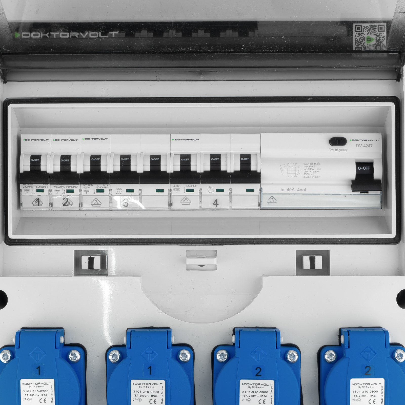 Die Stromverteiler DV-5541-D ist mit Leitungsschutzschalter (C16, C32) und Fehlerstromschutzschaltern 40A/30mA/10kA Typ A ausgestattet, die alle über ein VDE-Zertifikat verfügen, das bestätigt, dass die verwendeten Geräte den höchsten deutschen und europäischen Sicherheitsstandards entsprechen und zuverlässigen Schutz gegen Kurzschluss, Überlast und elektrischen Schlag bieten.