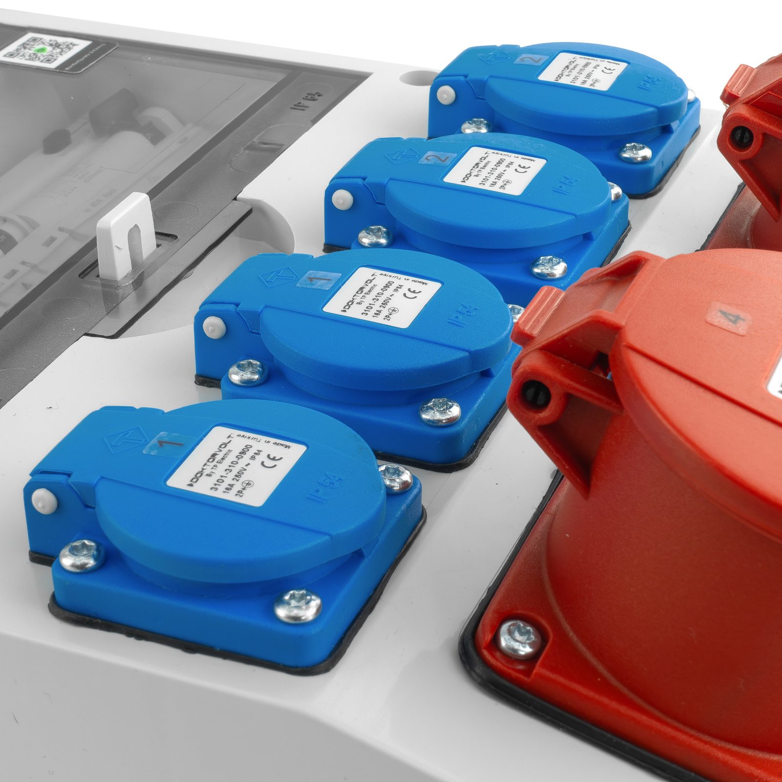 - 4 x 1-phasig (SCHUKO): 1P + N + PE, 16 A, 230 V, IP54