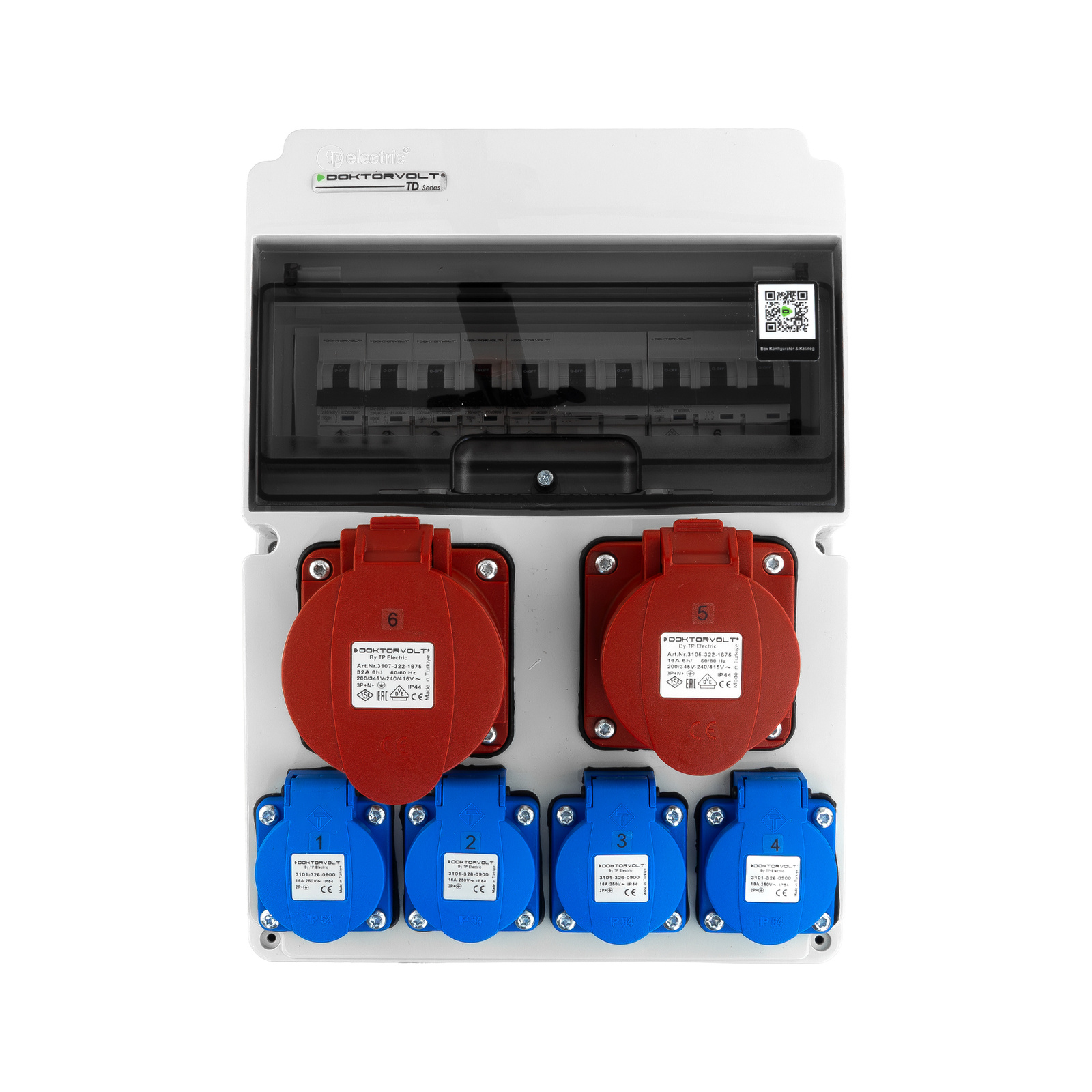 - Kompakter Bauverteiler JUN 32A/16A/4x230V mit Schutzart IP54. Anschlussfertig – ideal für Baustelle, Werkstatt und Outdoor-Events. Ausgestattet mit Drehstrom-Steckdosen und Leitungsschutzschaltern.