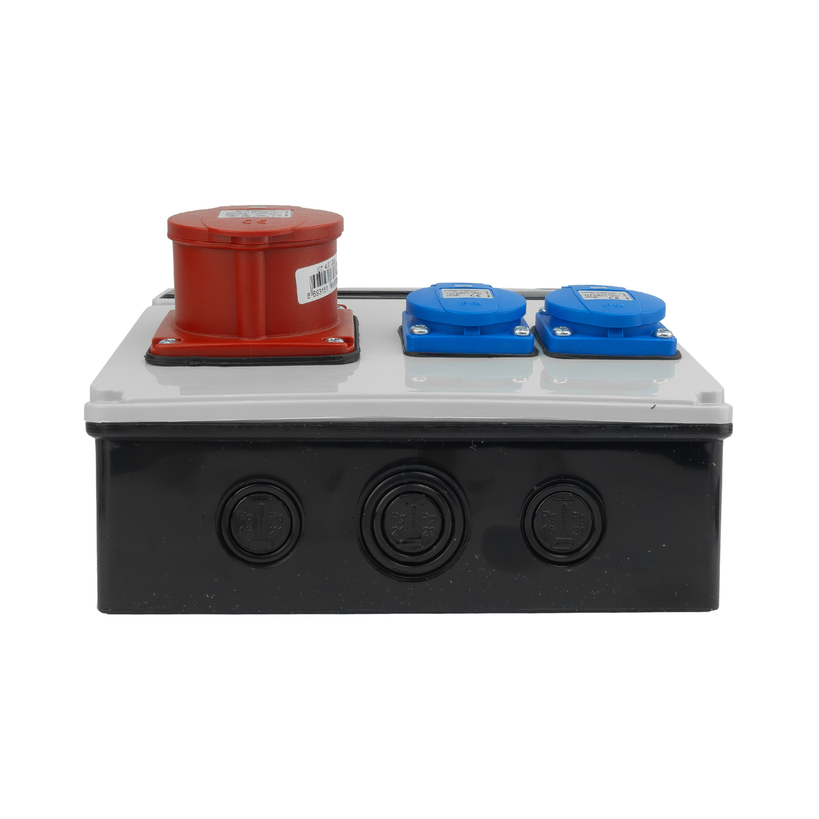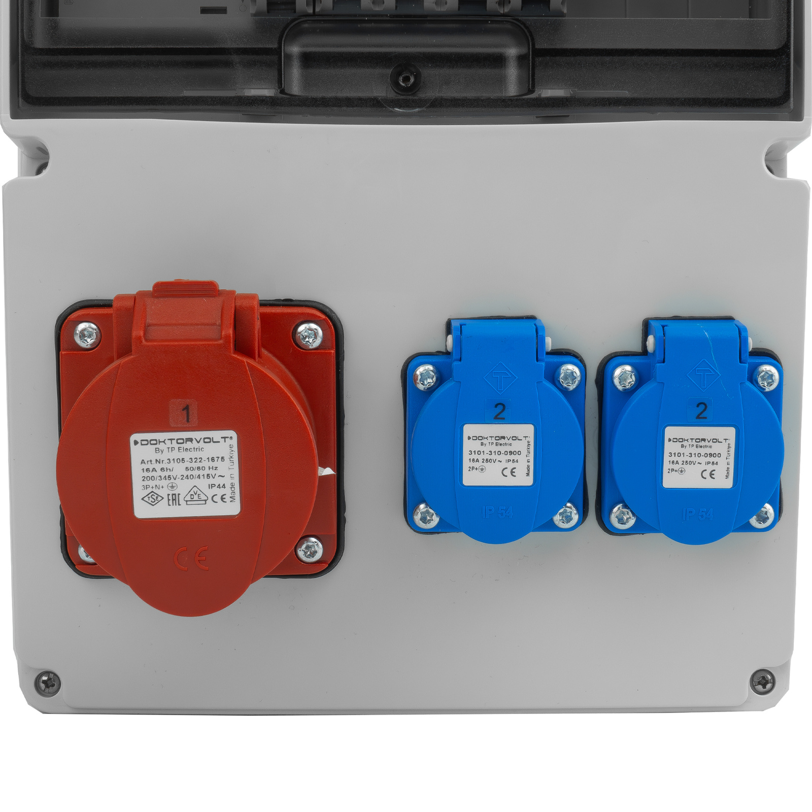 Stromverteiler DOKTORVOLT DV-5534-D (25A) mit Schuko- und CEE-Steckdosen, ausgestattet mit Siemens-Schutzgeräten sowie TÜV SÜD, VDE und CE-Zertifikaten, beständig bis -25°C.