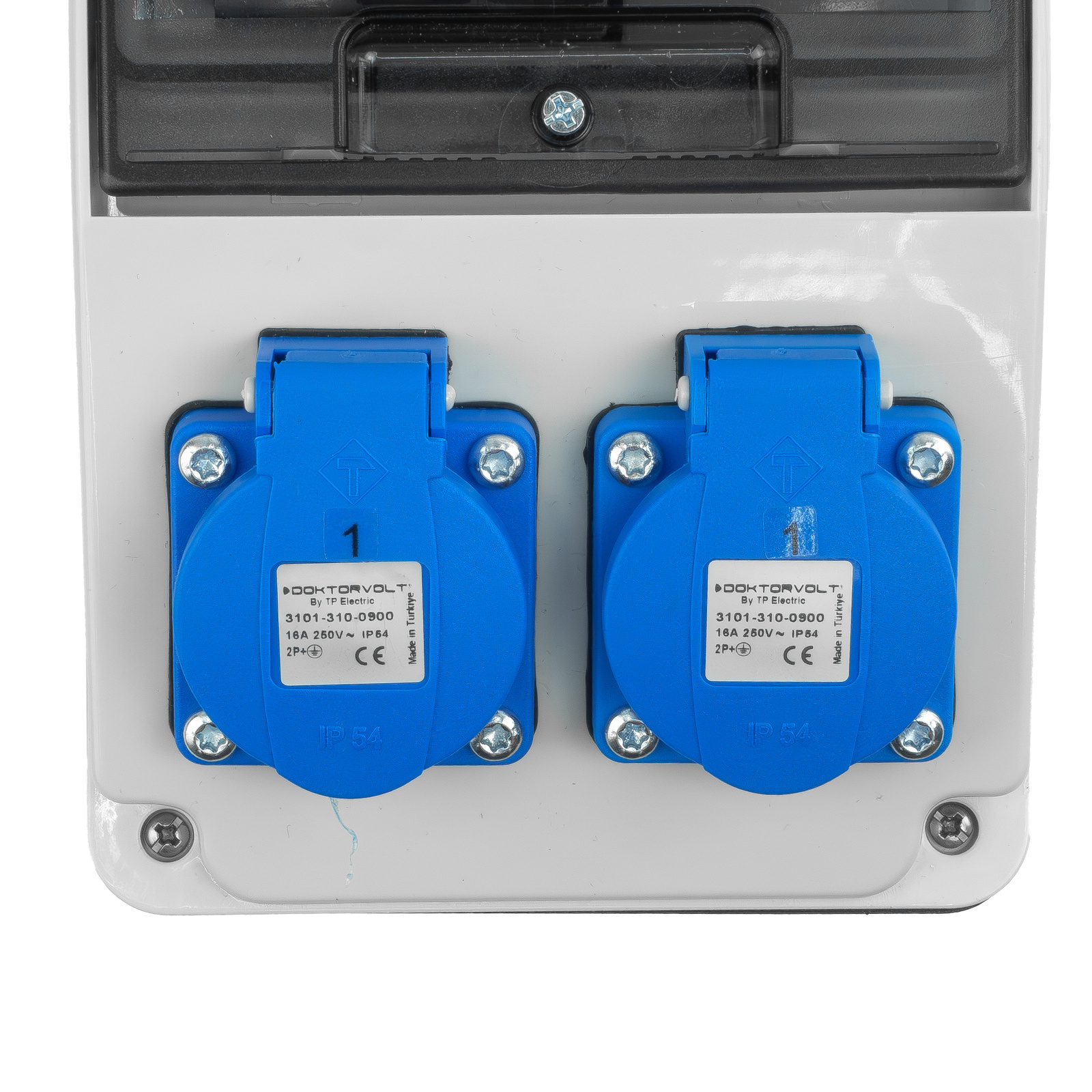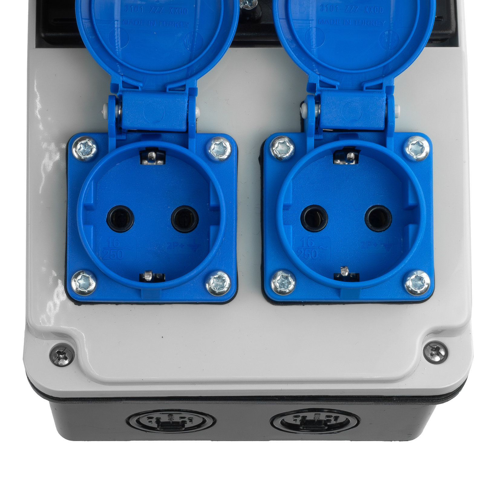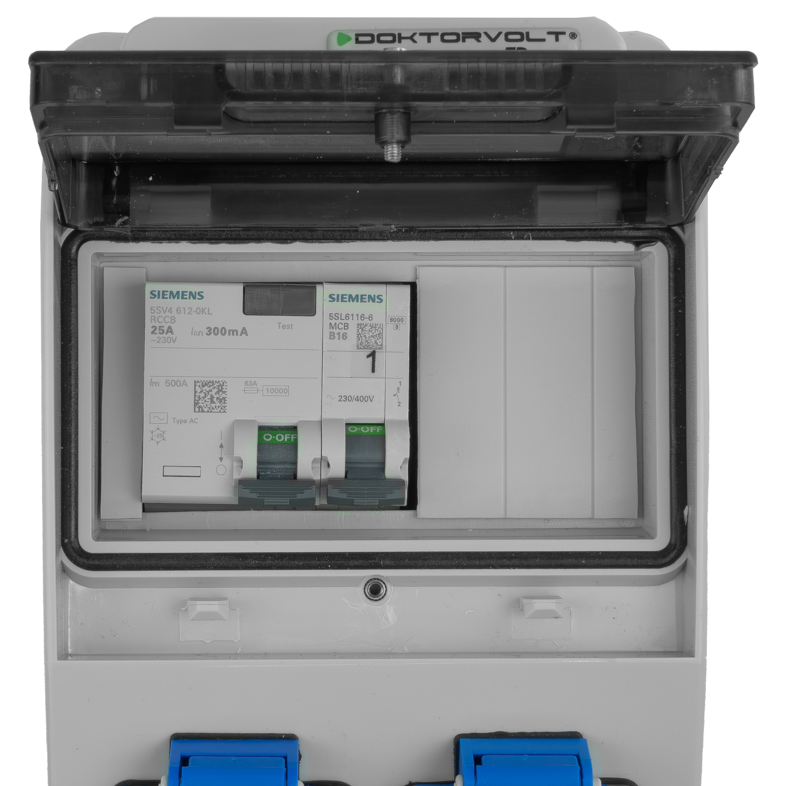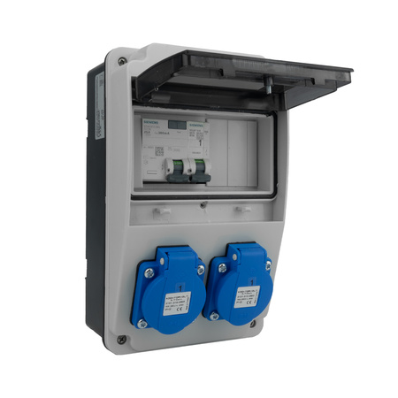 - Hochwertiger Stromverteiler mit 2x230V 16A und Schuko-Steckdosen, ausgestattet mit Siemens. Ideal für Werkstatt, Baustelle und Industrie – zuverlässige Stromverteilung mit höchster Sicherheit.