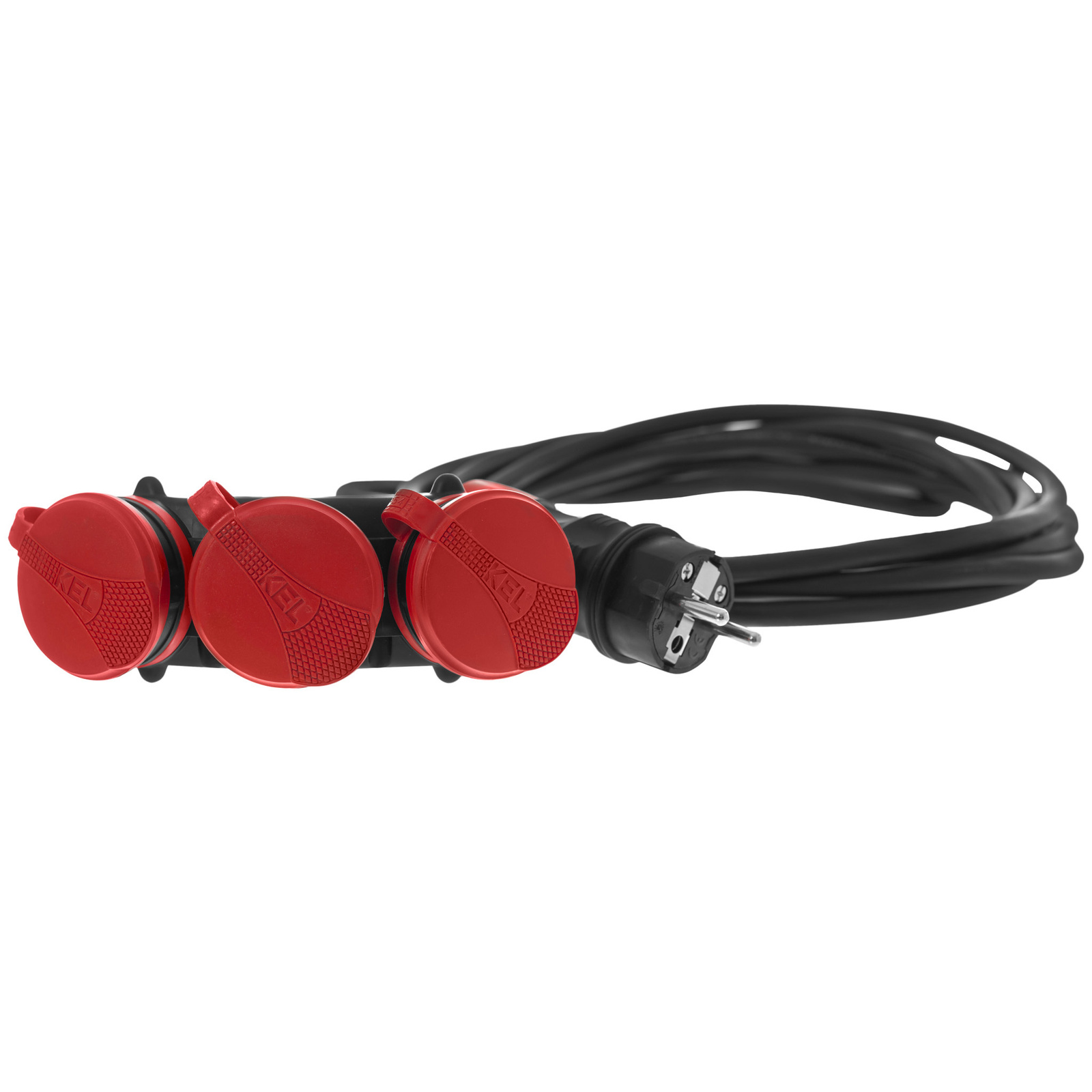 - Robustes Verlängerungskabel mit drei Schuko-Steckdosen 2P+Z 16A 250V, ausgestattet mit einem 5m Gummikabel H05RR-F 3×2,5 mm². Ideal für den Einsatz auf Baustellen und unter anspruchsvollen Außenbedingungen dank Schutzart IP44.