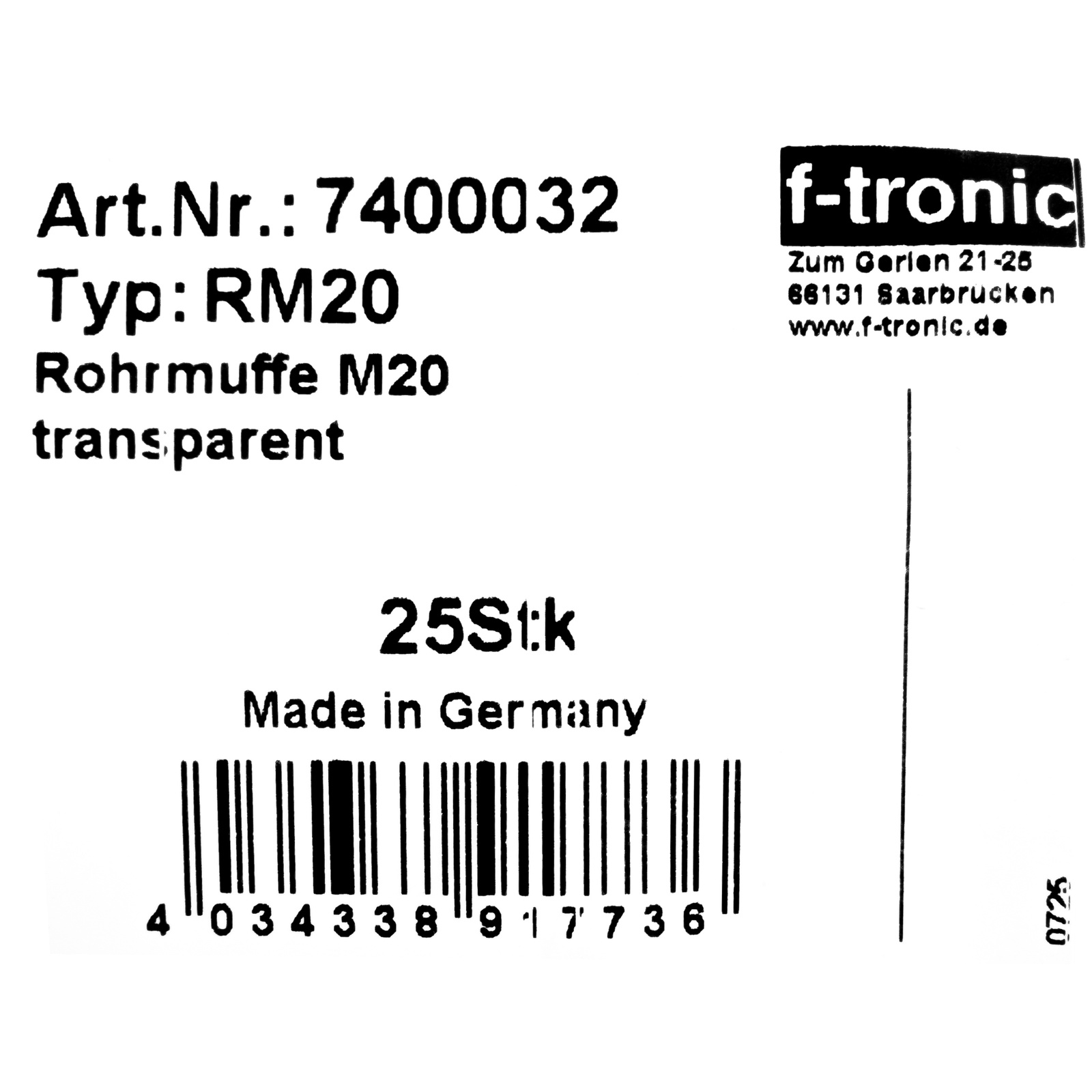 F-tronic Rohrmuffe zur Verbindung 1 Stück M20 Verbindungsmuffen transparent Muffe 7400032