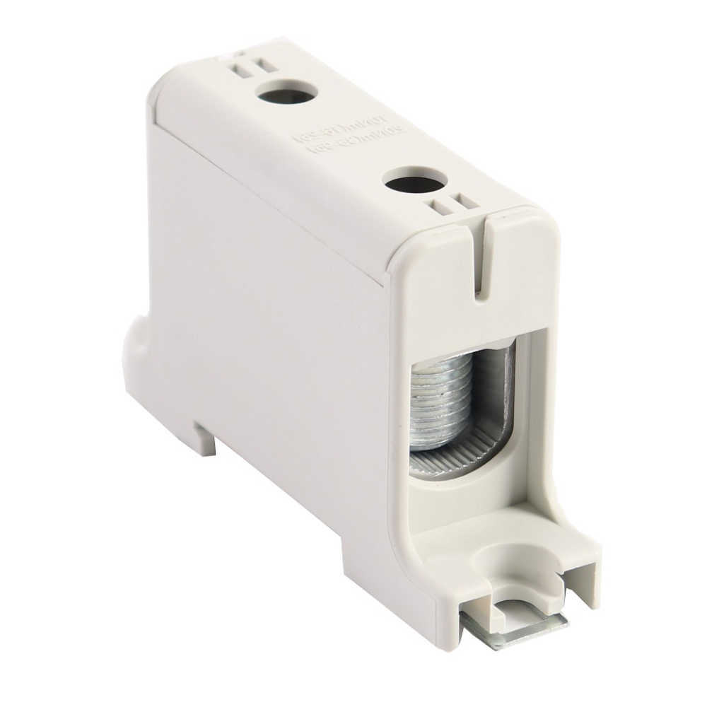 Universelle Schienenklemme (Al/Cu) ETB 95/1, ideal für alle Aluminium- und Kupferleiter mit einem Querschnitt von 16 mm² bis 95 mm². Elektrische Klemme zur Montage auf einer TH 35-Schiene. Hergestellt in der Brennbarkeitsklasse V2, maximale Betriebstemperatur beträgt +80°C. Die universelle Klemme (Al/Cu) ETB 95/1 wurde gemäß der Norm IEC 60947-7-1 getestet.