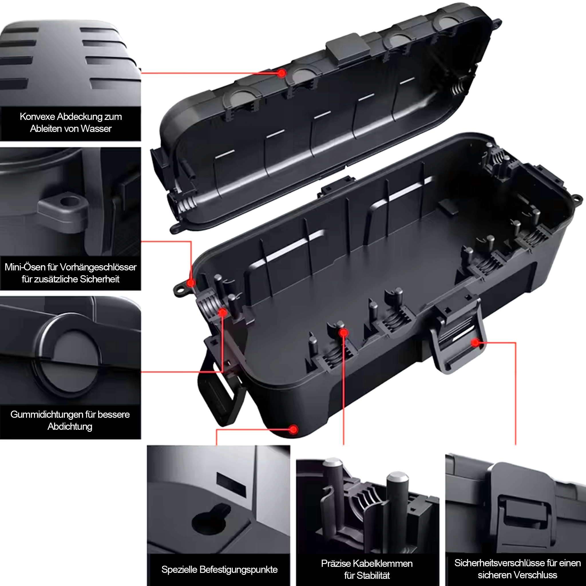 Robuste Kabelbox für den Außenbereich, groß, schwarz, 29 x 13,2 x 10 cm, IP54, wasserdicht, 6 Durchführungen, stabile Konstruktion, Gummidichtungen, mit Vorhängeschloss verschließbar