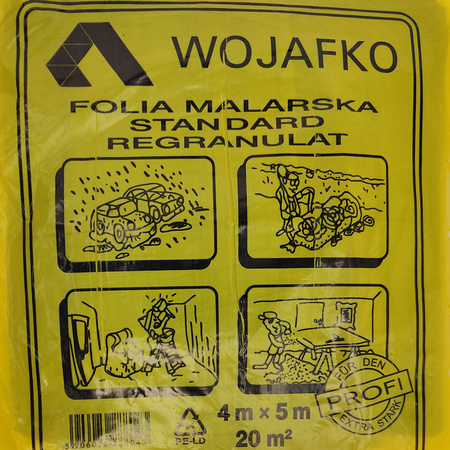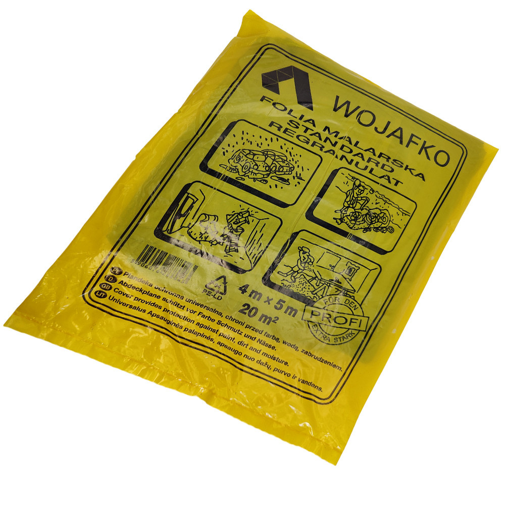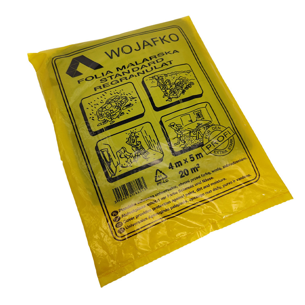 Lackierschutzfolie 4x5m STANDARD Wojafko Robuste Malerfolie von Wojafko mit den Maßen 4 x 5 Meter. Hergestellt aus starkem LD-PE-Kunststoff, schützt sie die Oberfläche vor Farbe, Wasser und anderem Schmutz.