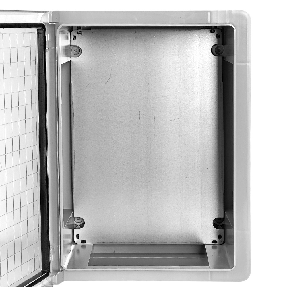 • Gehäuse 300x400x170mm der Marke TP Electric für die Montage von modularen Geräten auf einer Montageplatte. Der Verteilerkasten hat die Schutzart IP 65. Hergestellt aus hochwertigem ABS-Kunststoff und Polycarbonat. Widerstandsgrad IK10.
