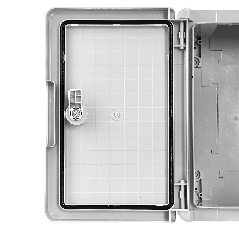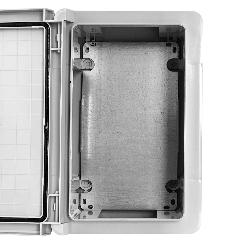 - Gehäuse 200x300x130mm der Marke TP Electric für die Montage von modularen Geräten auf einer Montageplatte. Schutzart IP65 des Verteilerkastens. Hergestellt aus hochwertigem ABS-Kunststoff und Polycarbonat. Widerstandsgrad IK10