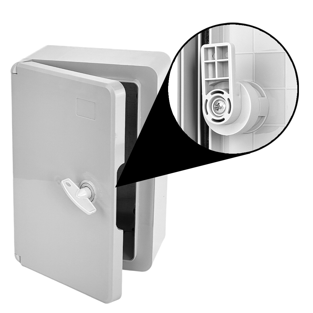 Der Schaltschrank ist aus hochwertigem ABS-Kunststoff und Polycarbonat gefertigt und passt mit seiner Farbe RAL 7035 (hellgrau) zu modernen optischen Standards. Außerdem lässt sich die Tür des Gehäuses bis zu 180° öffnen, was einen einfachen Zugang und eine komfortable Nutzung ermöglicht. Die Schutzart IK10 bedeutet Schutz gegen starke Stöße und macht das Gehäuse ideal für anspruchsvolle Umgebungen.