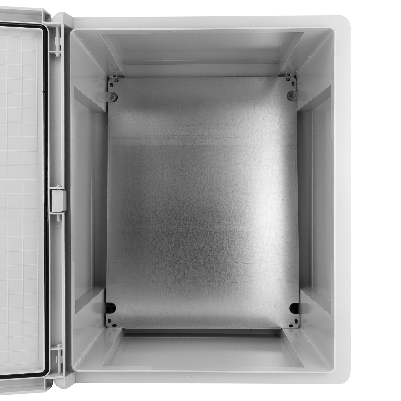 • Gehäuse 400x500x240mm der Marke TP Electric für die Montage von modularen Geräten auf einer Montageplatte. Schutzart IP65 des Verteilerkastens. Hergestellt aus hochwertigem ABS-Kunststoff und Polycarbonat. Widerstandsgrad IK10