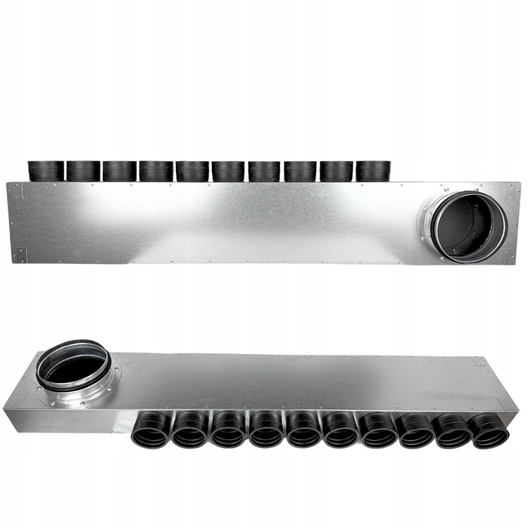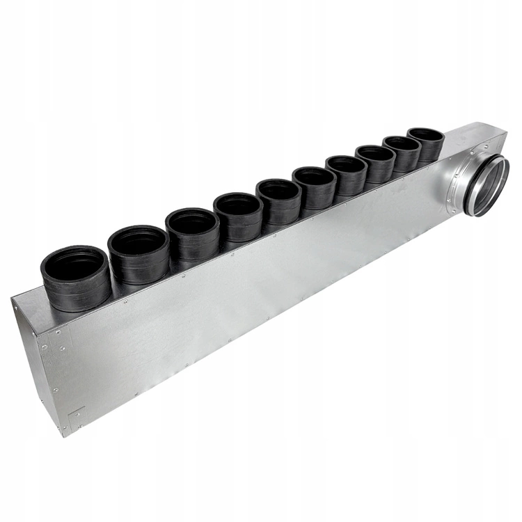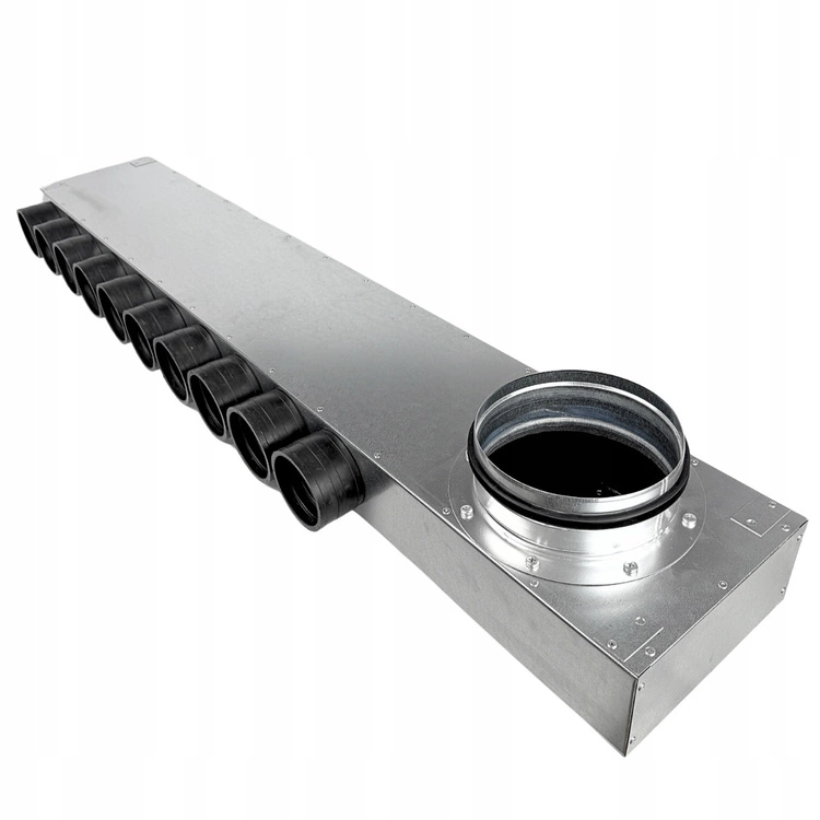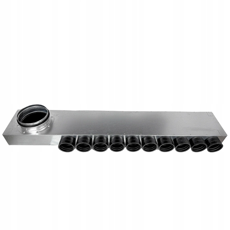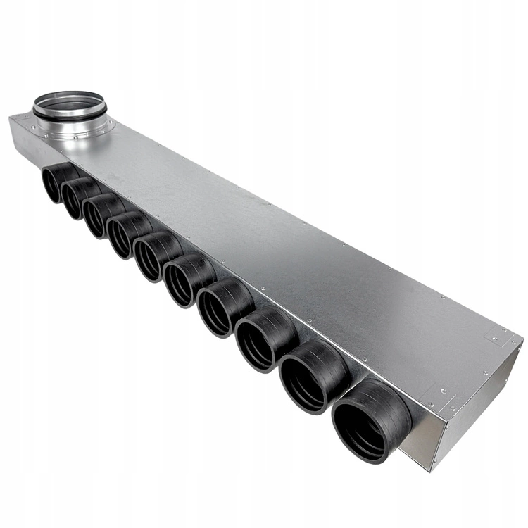 • Metallischer Lüftungsverteiler 10×75 mm mit Ø160 mm Anschluss. Ausgestattet mit Revisionsöffnung und austauschbarem Anschlussstutzen. Gedämmt mit antibakterieller Matte, selbstabdichtendes Verbindungssystem ohne zusätzliche Dichtungen.