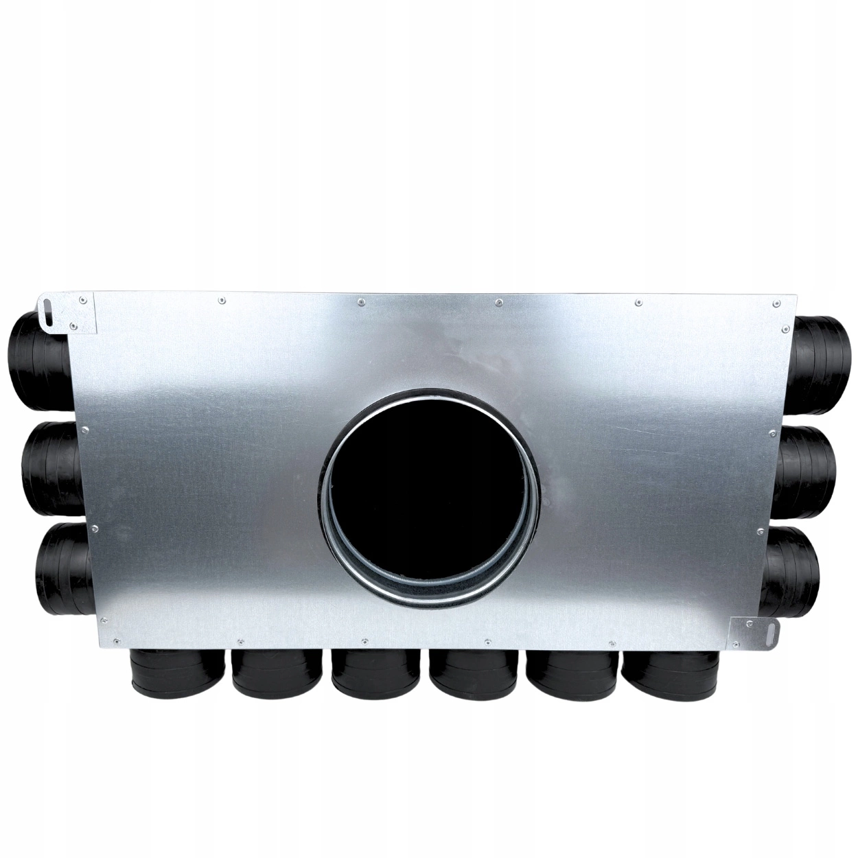 Zwölffachverteiler Ø75 mm für Lüftungssysteme. Gummianschlüsse machen zusätzliche Dichtungen überflüssig. Die eingesetzte antibakterielle Matte sorgt für Sauberkeit im System und einen leiseren Betrieb.