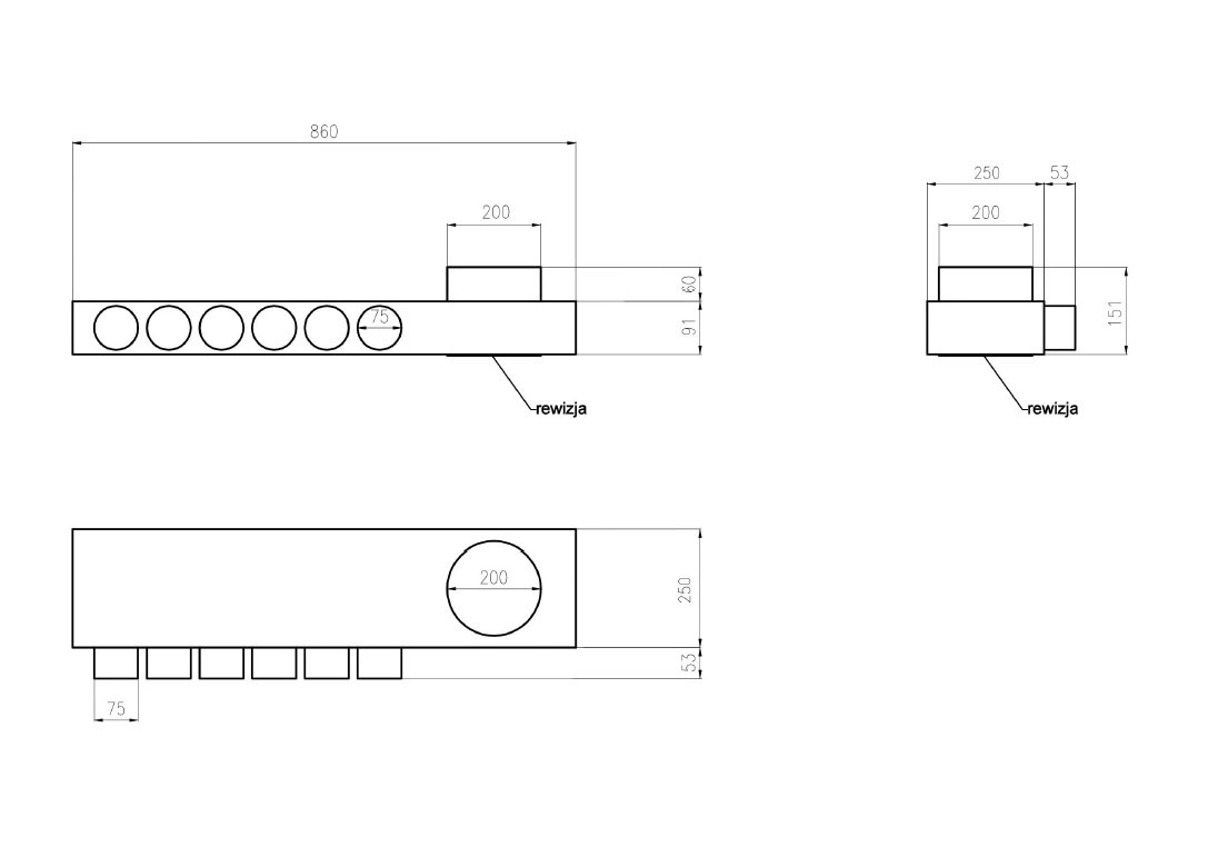 Modularer Lüftungsverteiler für Ø75-Rohre mit Revisionsanschluss Ø200. Ausgestattet mit Gummianschlüssen für eine dichte Montage ohne zusätzliche Dichtungen. Mit antibakterieller Dämmmatte für einfache Installation und vielseitige Anwendung.