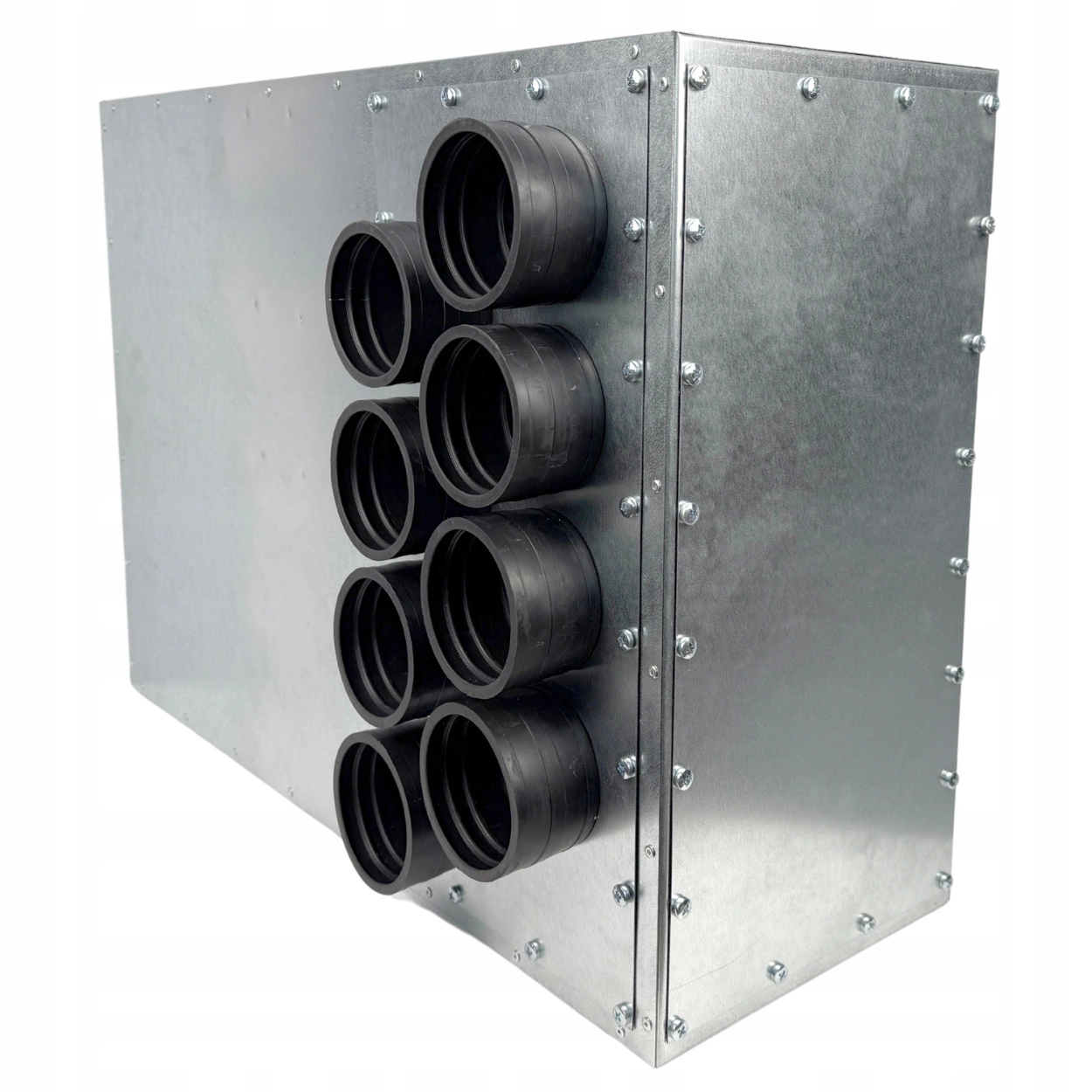 Ein Bestandteil eines Verteilersystems für mechanische Lüftung/Wärmerückgewinnung. Hergestellt aus verzinktem Stahl, ausgestattet mit acht Ø75 mm Anschlüssen und einem durchgehenden Ø160 mm Anschluss. Im Inneren befindet sich eine schallabsorbierende, antibakterielle Matte. Die selbstabdichtenden Gummianschlüsse ermöglichen eine schnelle Montage ohne zusätzliche Dichtungen. Die Frontplatte mit den Anschlüssen ist umsetzbar, was die Installation in verschiedenen Anordnungen erleichtert.